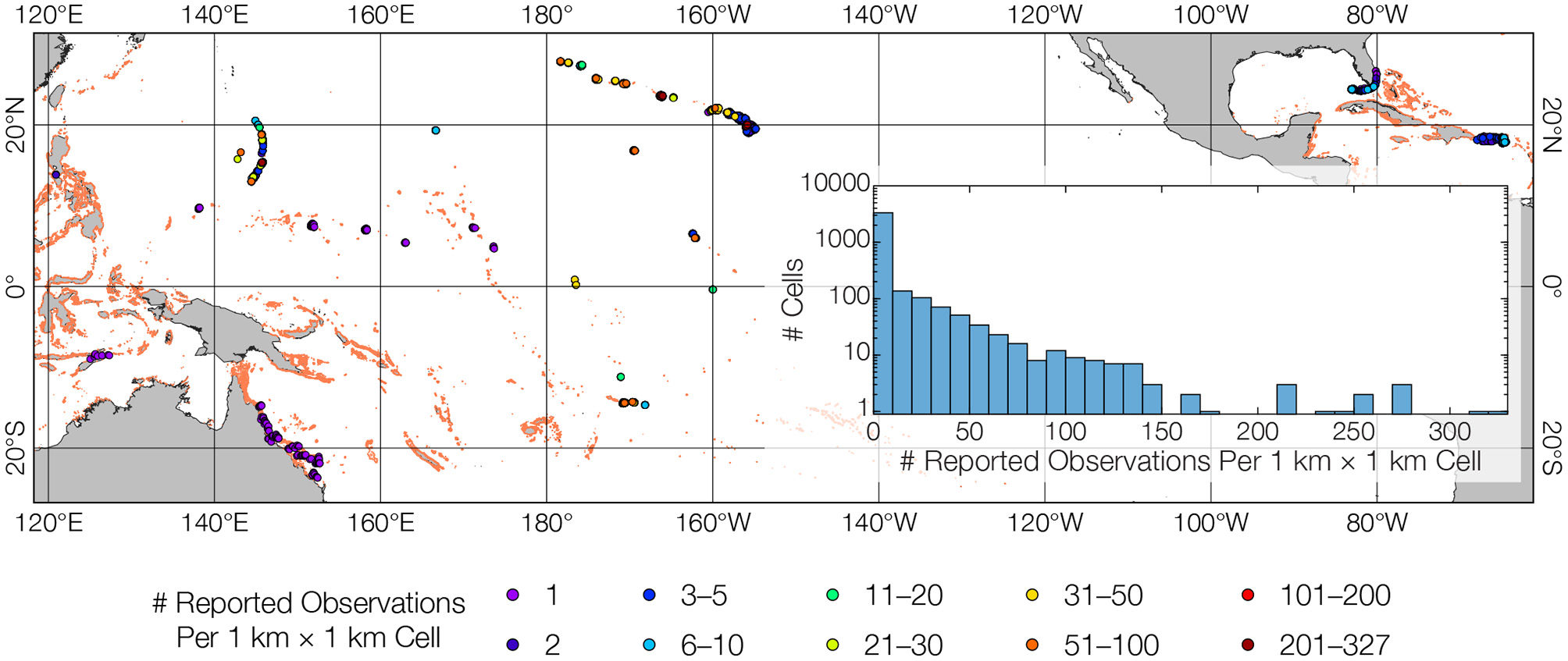 Spatially sparse and methodologically nonuniform in-water surveys. Readily available, publicly downloadable reef survey data highlight the current data paucity paradigm within reefs and across regions. The dataset bins 32,887 scattered observations into 1 × 1 km grid cells. Colored dots indicate number of observations in grid cells (higher numbers overlay lower numbers). Inset shows histogram for observations cell−1; note log scale for vertical axis. Of 3,875 cells, 60.7% comprise only a single observation, 83.3% have ≤ 5 observations, only 9.1% have ≥ 20 observations. Some observations presented as single values are actually averages of several underlying data points (e.g., Australian Institute of Marine Science data for the Great Barrier Reef), while other observations require computation of benthic cover from raw counts (e.g., most NOAA data for Pacific islands). This compounds the fundamental issue that data from different regions are acquired using different methods for different purposes. These are major hinderances for regional and global reef syntheses.