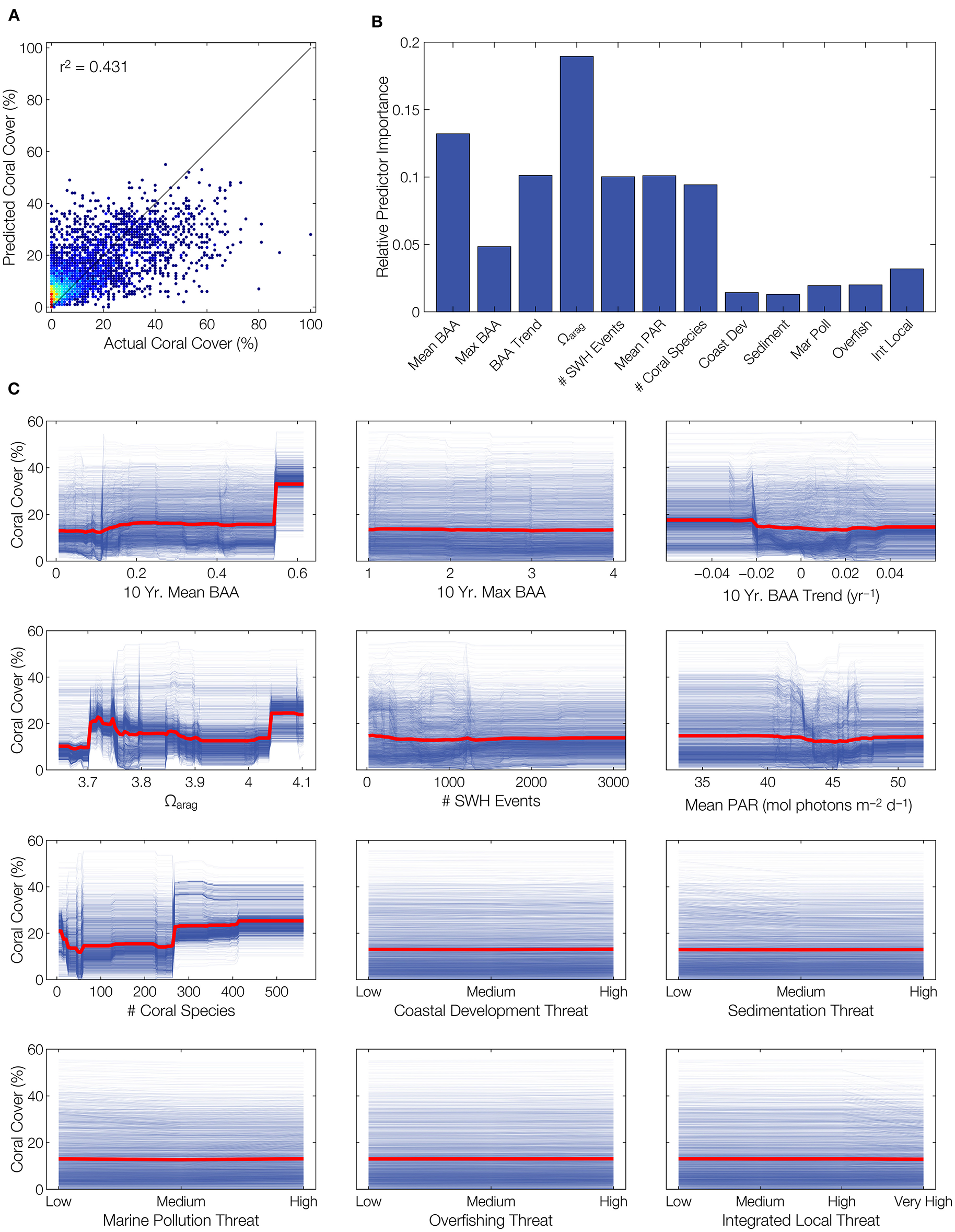 Poor predictability of coral cover using combined biogeophysical forcing parameters. Of multivariate models fit to the data set, a bootstrap aggregated (bagged) ensemble regression tree provides the best predictions of coral cover. However, the model only explains 43% of the variability in coral cover, reinforcing the proposition that available data are insufficient for quantitative modeling of coral reef condition with respect to environment. (A) Model predictions vs. actual coral cover, with colors indicating point densities (blue is lower density, red is higher density). (B) Relative importance for each predictor in the multivariate model. (C) Partial dependence plots (red lines) and individual conditional expectation plots (blue lines) illustrating model prediction responses to each predictor variable.