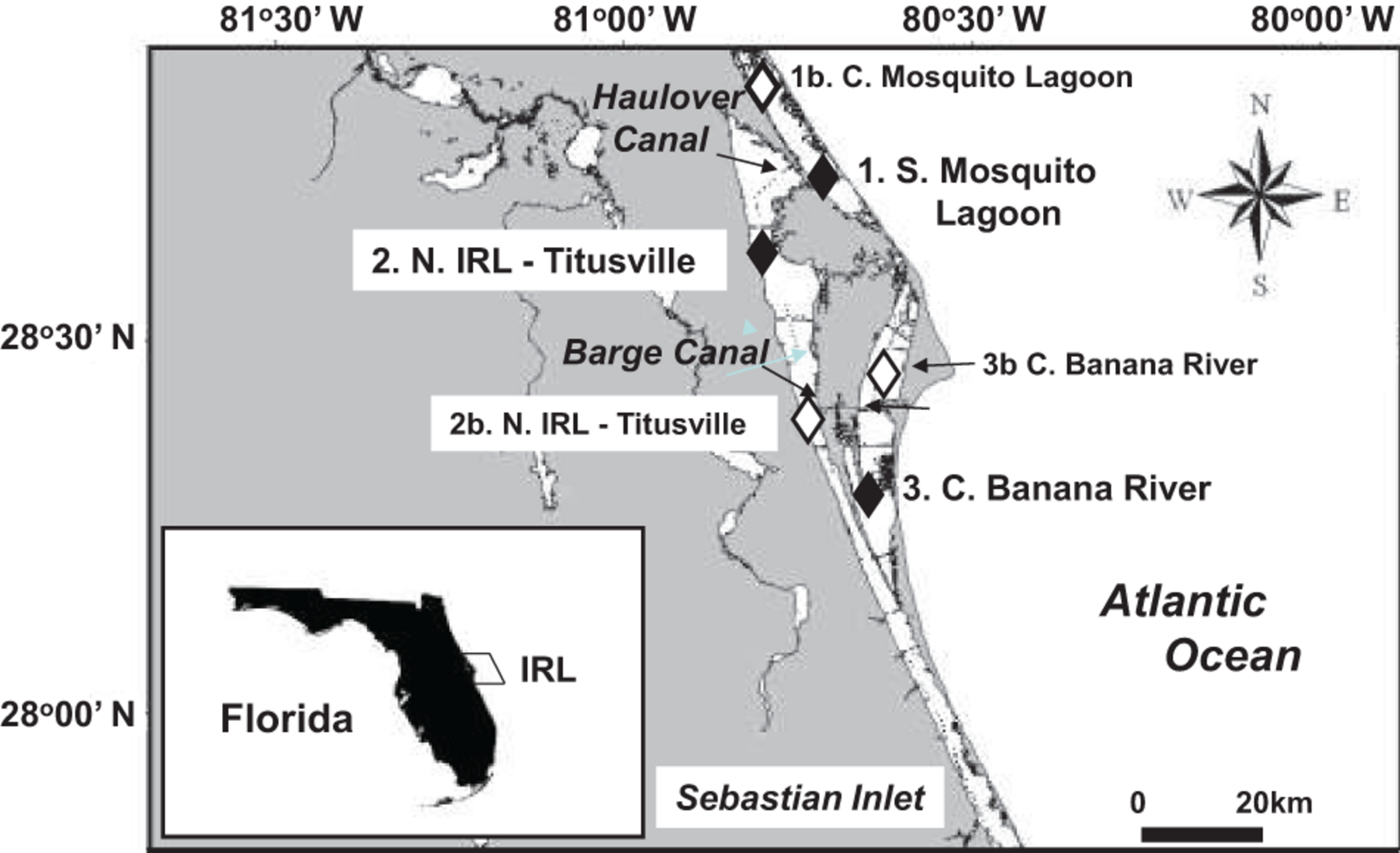 The three sub-regions of the NIRL are connected by navigational canals (i.e., Haulover and Barge canals) and natural gaps in land barriers. All three sub-regions are microtidal and have long water residence times, with estimated mean water half-lives (i.e., E50—50% exchange) of 75 days in the southern Mosquito Lagoon, 107 days in the NIRL, and 156 days in the Banana River Lagoon (Sheng and Davis, 2003; Steward et al., 2005). All three sub-regions included in the study are characterized by small watersheds relative to the size of the receiving basins, but vary in terms of land-use (Sigua and Tweedale, 2003; Adkins et al., 2004; Steward et al., 2005; Gao, 2009). The Banana River Lagoon watersheds have significant urban/residential areas, along with some agricultural uses and undeveloped lands. The watersheds of the southern Mosquito Lagoon and NIRL near Titusville are characterized by higher percentages of natural upland and wetland preserves (mostly associated with the Canaveral National Seashore and Merritt Island National Wildlife Refuge) than the Banana River Lagoon. The southern Mosquito Lagoon does experience some tidal and wind–driven water exchange with the northern Mosquito Lagoon, which is characterized by moderate urban and residential development.
