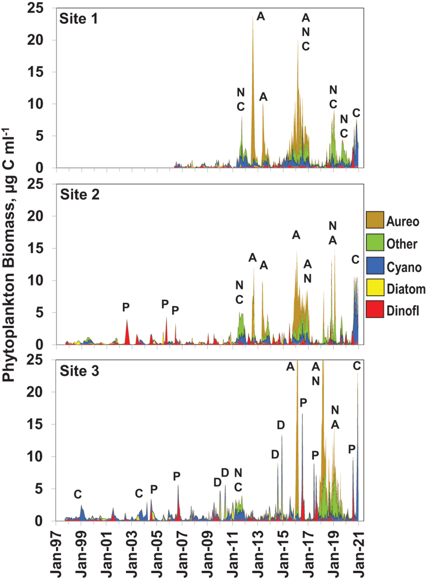 Phytoplankton biomass (μg carbon ml–1) at the three sampling sites, i.e., Site 1 in the southern Mosquito Lagoon, Site 2 in the northern Indian River Lagoon at Titusville, and Site 3 in the central Banana River. Biomass values are subdivided into five categories, i.e., dinoflagellates (red), diatoms (yellow), cyanobacteria (blue), Aureoumbra lagunensis (orange), and all other taxa (green). Letters above major peaks in biomass show the dominant taxa in the major bloom peaks, i.e., A—A. lagunensis, C—picoplanktonic cyanobacteria, D—diatoms, N—nanoplanktonic eukaryotes (undefined taxa), P—Pyrodinium bahamense.