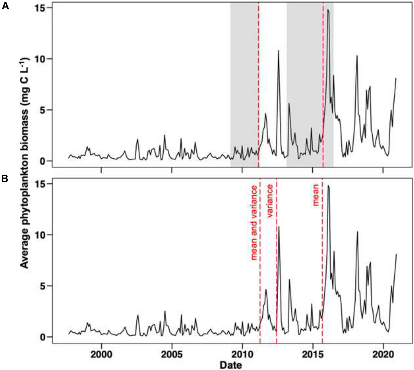 Changepoints detected using a regression-based approach (A) and by testing for differences in the mean and variance, mean only, and variance only (B) in total phytoplankton biomass for NIRL, i.e. Sites 1-3 combined. Changepoints are shown as dotted red lines. In panel (A), the shaded gray background corresponds to the 95% confidence interval for the two changepoints; confidence intervals could not be calculated for the changepoints shown in panel (B) due to constraints of the underlying methodological approach.