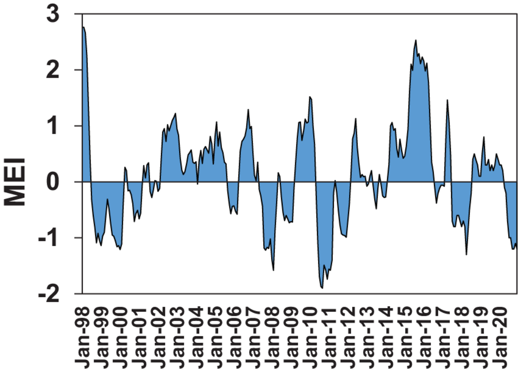 Multivariate ENSO Index (MEI) from 1998 to 2020. Positive values indicate El Niño periods and negative values La Niña periods.