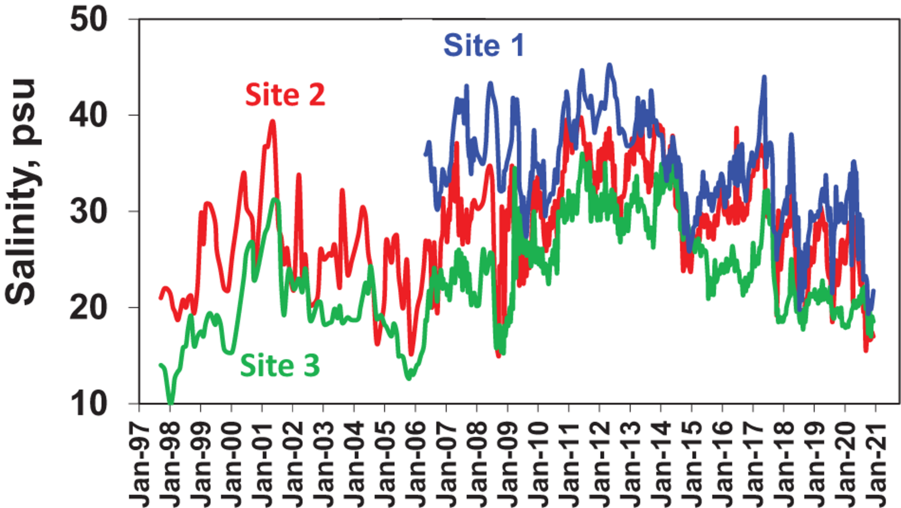 Surface water salinities at the three primary sampling sites, i.e., Site 1 in the southern Mosquito Lagoon (blue line), Site 2 in the northern Indian River Lagoon at Titusville (red line), and Site 3 in the central Banana River (green line).