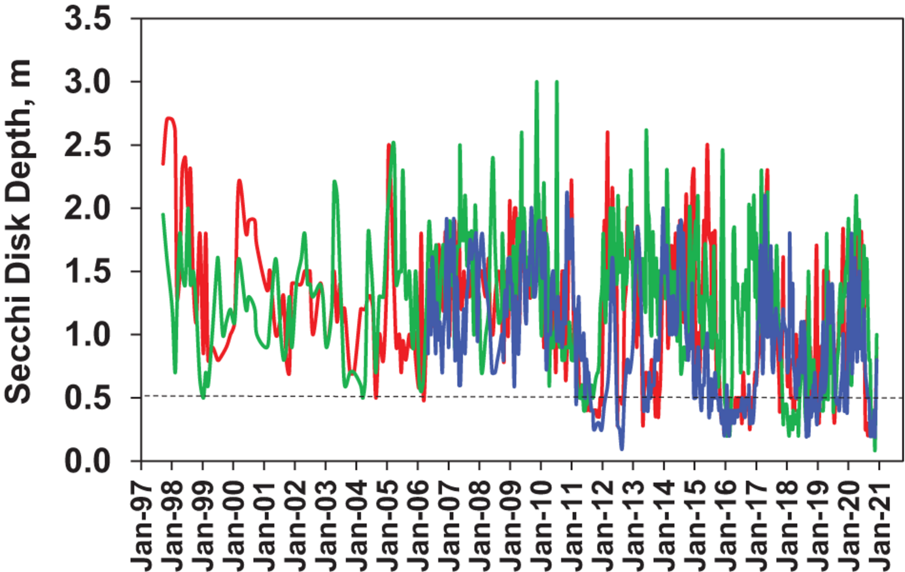Secchi disk depths varied between 0.5 and 2.5 m in all three sub-regions of NIRL over the first 13 years of the study (Figure 8). After 2010, extended periods of Secchi depths below 0.5 m were observed in all three sub-regions in association with major phytoplankton bloom events, with values as low as 0.1 m.