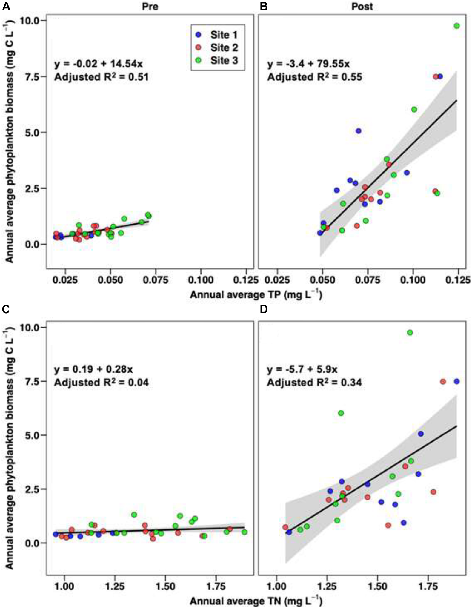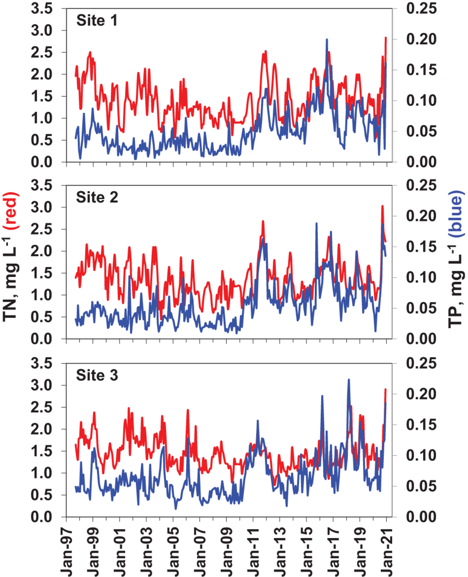 Data for total phosphorus (TP) and total nitrogen (TN = total Kjeldahl nitrogen + NOx) were obtained from the St. Johns River Water Management District, Palatka, Florida,3 which carries out contemporaneous monthly analyses of water chemistry on samples collected during this project. Data from May 1997 through April 2020 were selected.