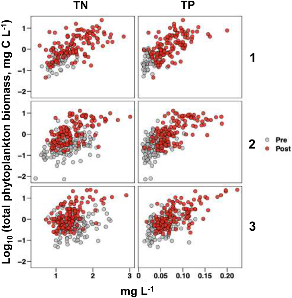In addition to cyclical patterns, there can be progressive trends or sudden shifts in the intensity and composition of phytoplankton blooms. One of the drivers of progressive increases in bloom activity is elevated nutrient loads associated with both natural and anthropogenic eutrophication (Nixon, 1995; Cloern, 2001; Anderson et al., 2008; Heisler et al., 2008; O’Neil et al., 2012; Glibert, 2020). There is also evidence that changes in ecosystem structure and function are not always gradual and progressive, but can be sudden, dramatic, and persistent. Such changes often are referred to as regime shifts, state changes; or alternative stable states (Beisner et al., 2003). A number of examples of regime shifts have been reported for freshwater and marine ecosystems (Spencer et al., 2011; MacNally et al., 2014; Capon et al., 2015; Beaugrand, 2015; Möllmann et al., 2015). One of the commonly referenced examples of regime shift is the change from macrophyte to phytoplankton domination in shallow lakes associated with advanced stages of eutrophication (Scheffer et al., 1993; Janssen et al., 2014). Confirmed cases of regime shifts in marine ecosystems are less numerous than for freshwater environments, particularly in sub-tropical and tropical regions (Viaroli et al., 2008; Spencer et al., 2011; MacNally et al., 2014). For estuarine and nearshore marine systems, MacNally et al. (2014) emphasized that the term regime shift should be limited to a “stark change” in the biology of an ecosystem inferred from long-term empirical data. However, recent reviews of a wide range of reported regime shifts suggest that many do not necessarily meet these criteria (Spencer et al., 2011; MacNally et al., 2014; Capon et al., 2015). In addition, it has been suggested that quantitative modeling approaches should be used to supplement empirical observations in verifying the designation of stark changes in ecosystems as regime shifts (Scheffer and Carpenter, 2003; Spencer et al., 2011).