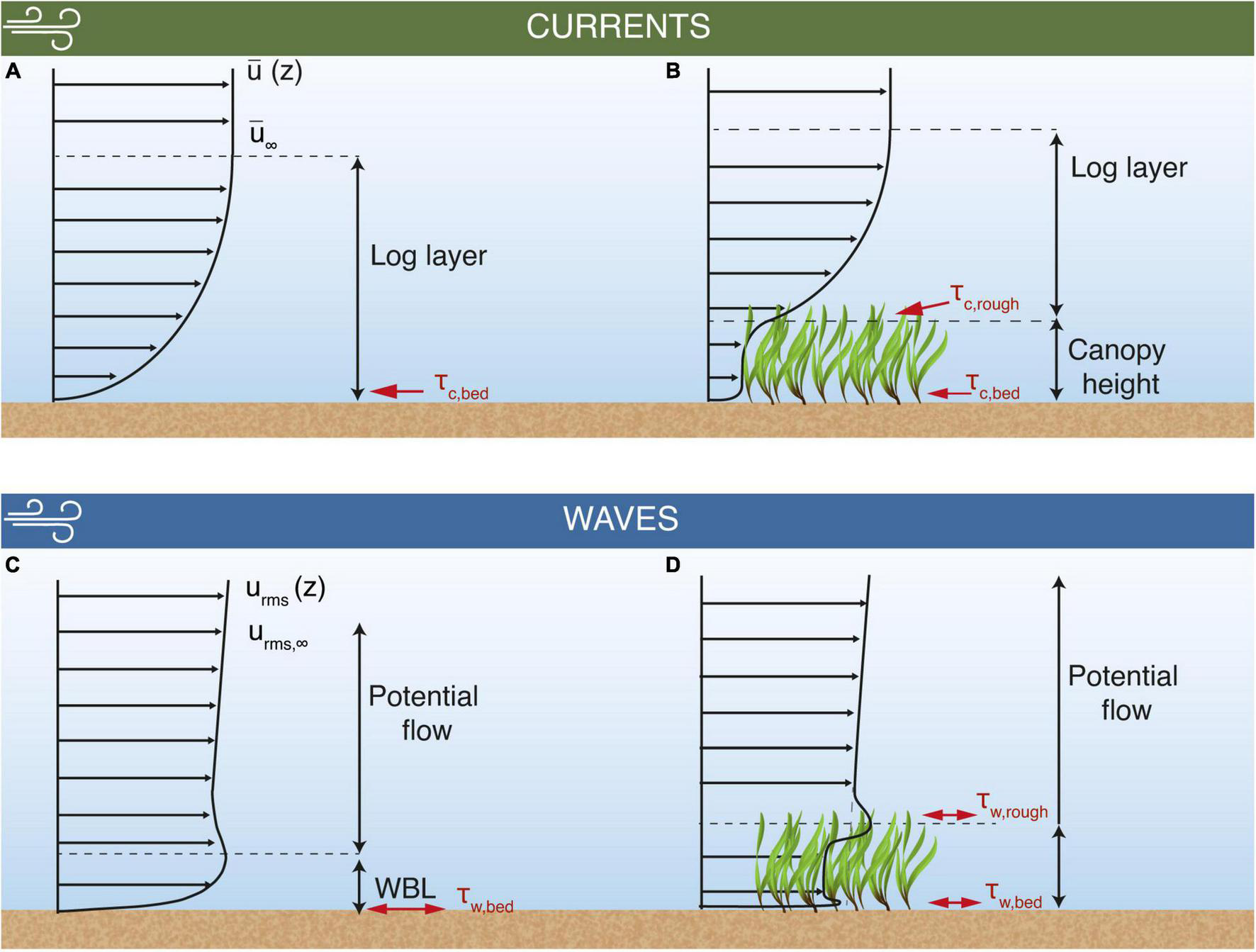 Conceptual model of the flow interactions between mean currents and root-mean-squared wave orbital velocities with seagrass canopies and the influence on shear stresses. The mean current develops a logarithmic velocity profile (log layer, A), exerting a shear stress on the bed sediment (τc,bed). Above the log layer, current and wave velocities attain free stream values, denoted as and urms,∞, respectively. The log layer is shifted above the canopy when a sufficiently dense seagrass meadow is present (B), altering τc,bed and enhancing the shear stress at the seagrass/water interface (τc,rough). When waves are present, the root mean square of the oscillatory velocity component (urms) develops a wave boundary layer (WBL, C) and wave bed shear stress (τw,bed). The growth of this WBL is limited when a seagrass canopy of sufficient density is present (D). Additionally, a wave-driven shear stress is created at the top of the canopy (τw,rough) due to its interaction with the waves.