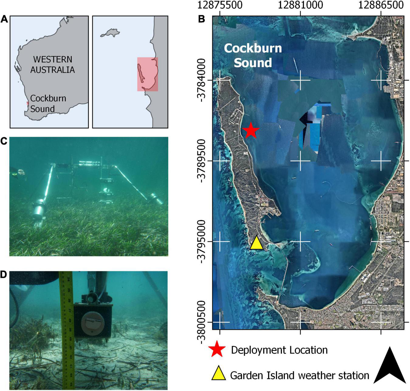Instrument frame deployment location relative to (A) Western Australia and within (B) Cockburn sound. (C) Underwater photos of the instruments positioned over a seagrass canopy and (D) over a bare bed with the optical backscatter sensor and sediment intake port shown. The red box in (A) represents the approximate region shown in (B).