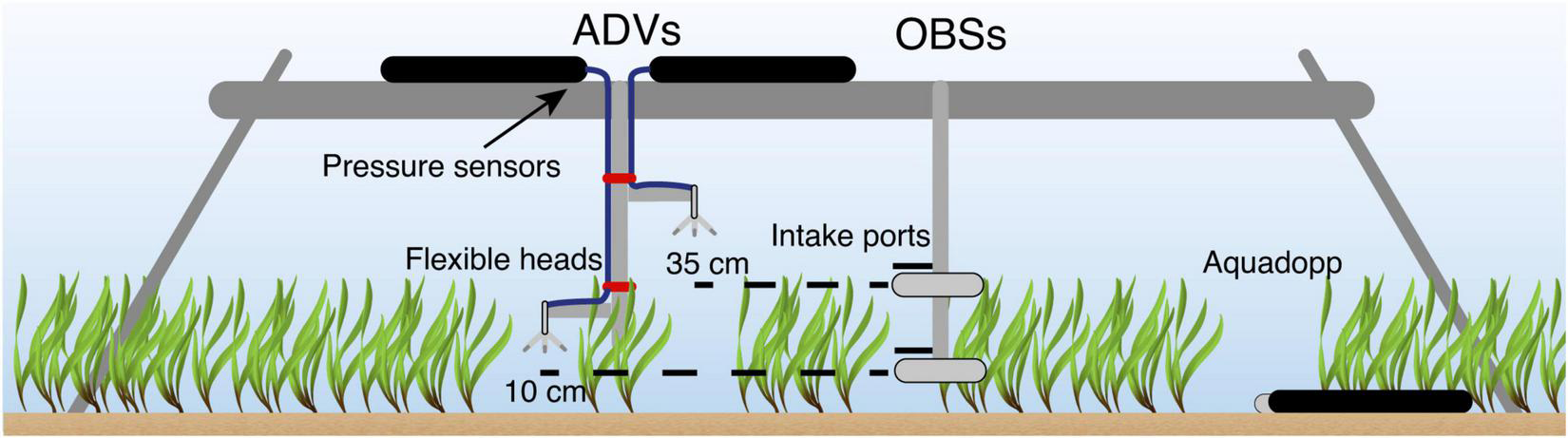 A 2-week field experiment (16–31 October 2015) was conducted using an instrument frame (Figure 3) deployed sequentially over a dense seagrass meadow and then a sandy bed. The instrument frame was first deployed over a dense Posidonia seagrass meadow (the “canopy” site) for 7 days. The seagrass canopy at the site had a shoot density of 400 ± 88 shoots m–2 and average height of 35 ± 3 cm when fully upright. This study was part of a larger experiment, with detailed properties of the seagrass meadow reported in Olsen et al. (2018). After the first 7 days, the instrument frame was then moved approximately 40 m to an area with no seagrass (the “bare bed” site). The water depth at both sites was ∼1.5 m. The proximity of these two sites enabled us to isolate the impact of the seagrass canopy on the hydrodynamics and sediment transport processes.
