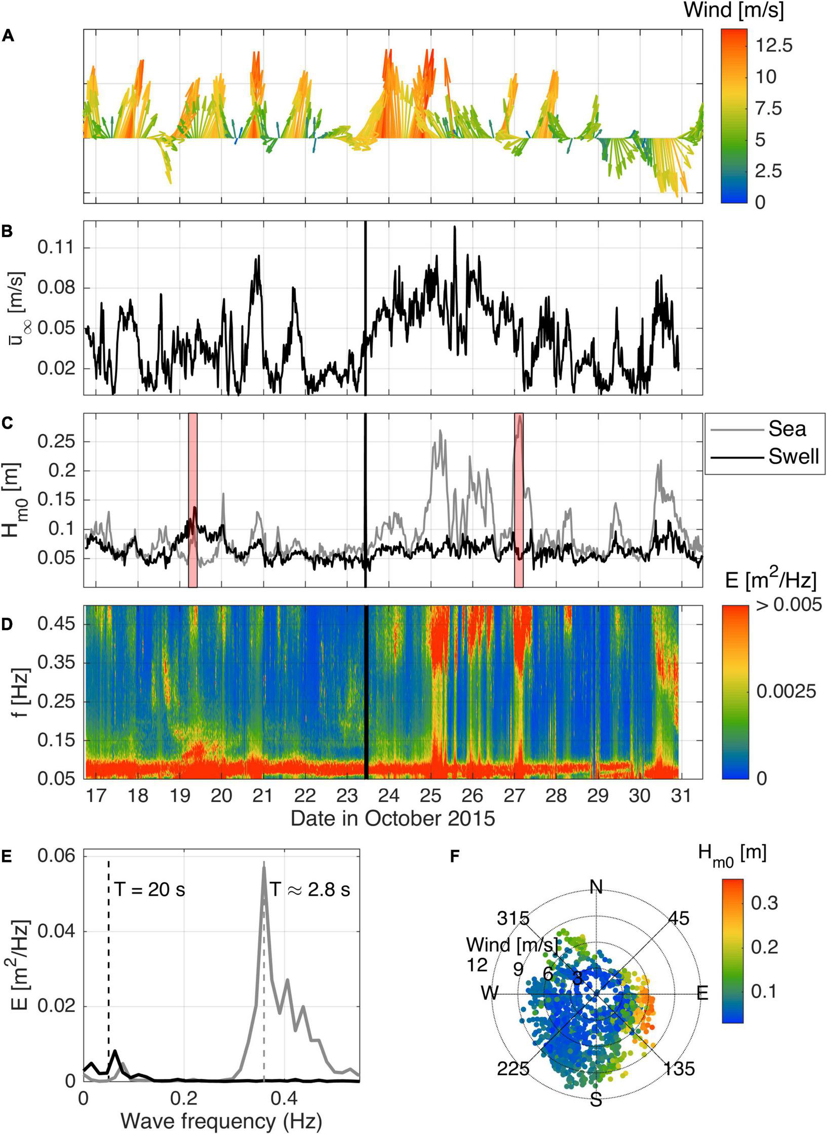 Local forcing conditions during the field experiment. (A) Wind speed and direction time series from the weather station at Garden Island (see Figure 2); (B) free-stream velocity measured by the ADP at 100 cmab; (C) decomposed sea and swell significant wave heights; (D) time series of wave spectra, where the colorbar was cut to emphasize the high-frequency, lower-energy part of the spectra; (E) typical wave spectra for swell- (black) and sea-dominated (gray) conditions; (F) directional scatter plot showing wind speed and wave height (colored dots). The black line in (B–D) indicates when the instrument frame was moved from the canopy site to the bare bed site (23/10/2015 10:00). The red patches in (C) identify the periods for which wave spectra in (E) were calculated.