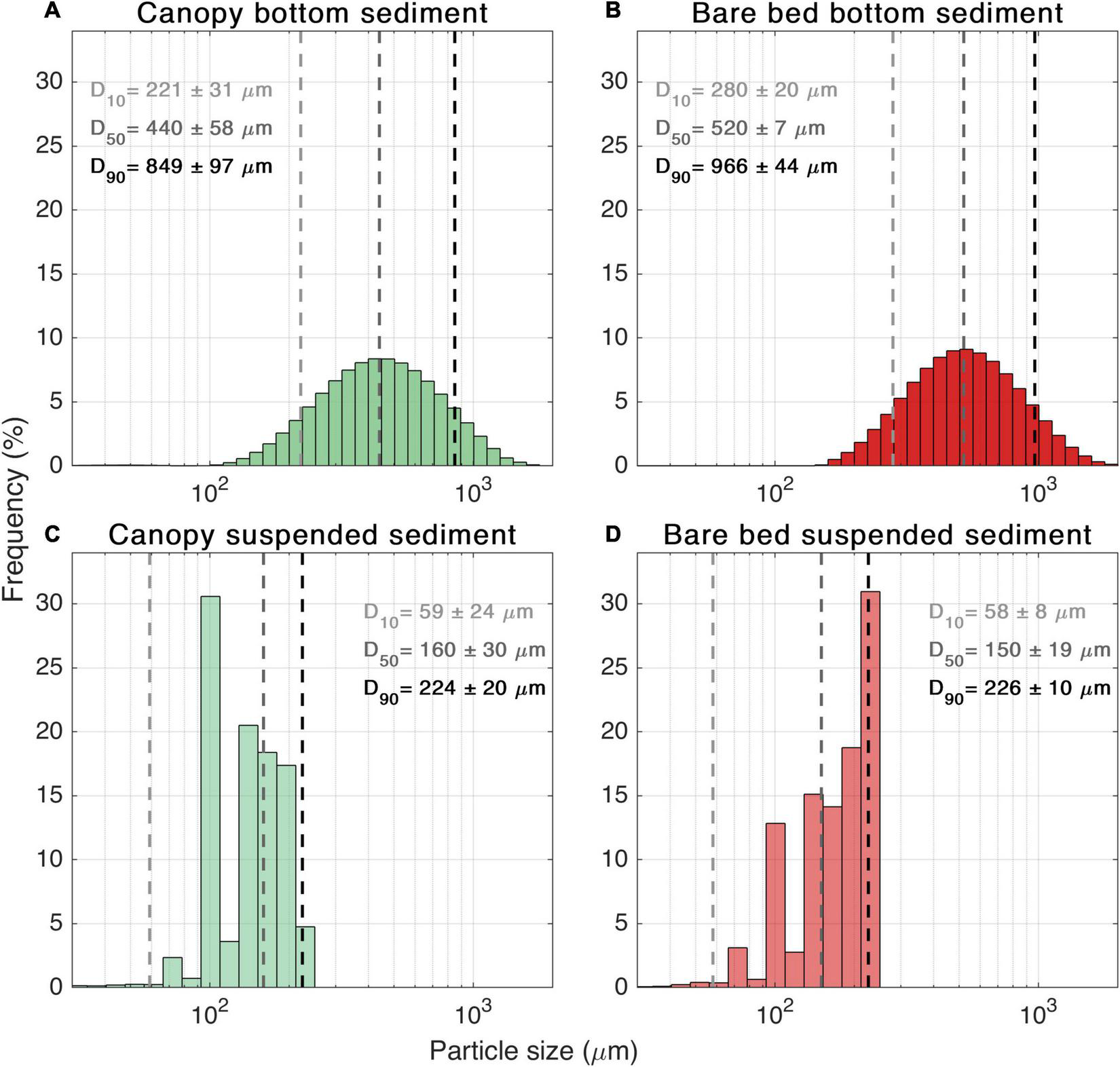To relate the suspended sediment grain size distribution to the shear stresses above and within the canopy, we determined the equivalent grain size that could be suspended by a given shear velocity based on the downward particle fall velocity (ws). We adopted the formulations by Soulsby (1997):