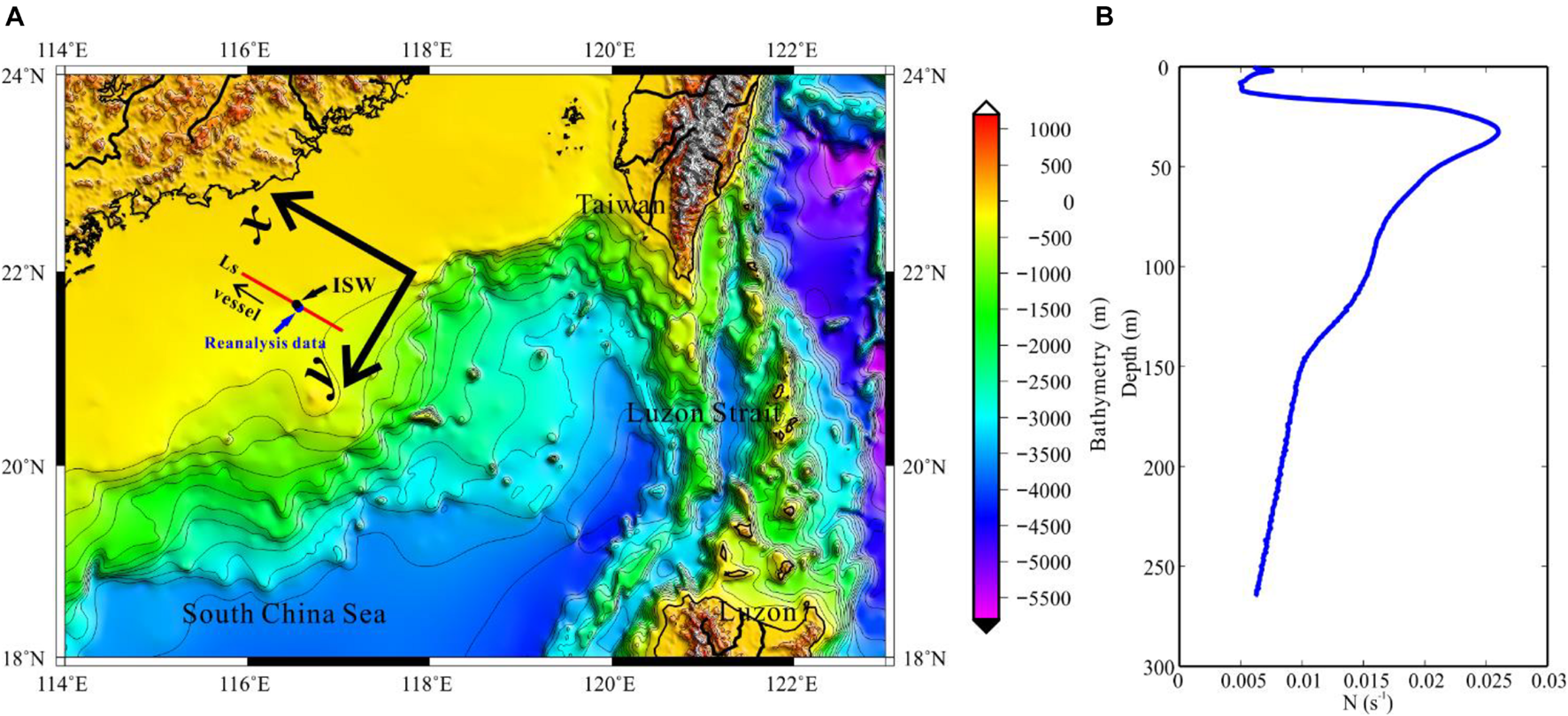 (A) The observation location and bathymetry. The red line is location of seismic section (Ls). The black dot is the location of the internal solitary wave in seismic section. The blue dot is the location of reanalysis data. The arrow indicates the direction of vessel. (B) The buoyancy frequency estimated from reanalysis data.