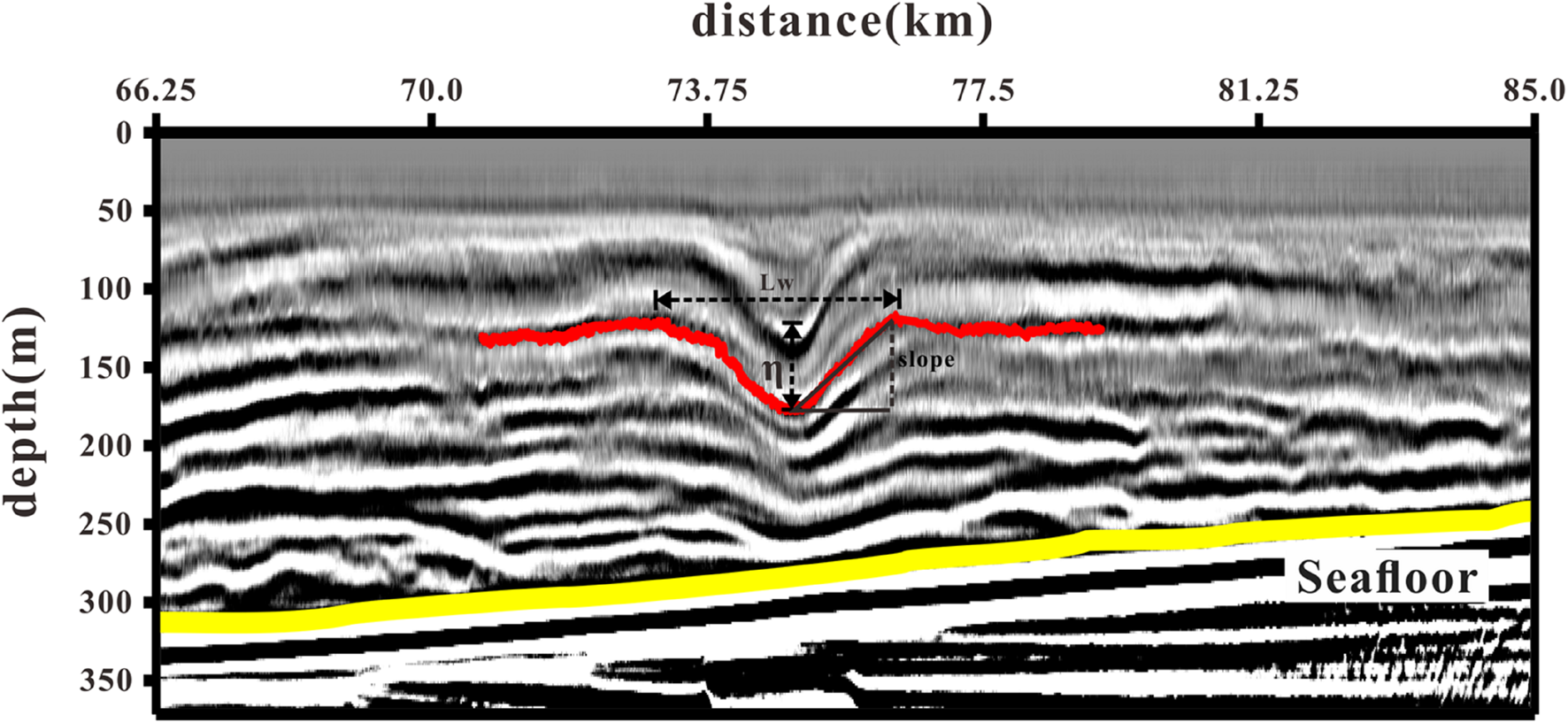 Schematic diagram of amplitude (η), wavelength (Lw), and the slope of the leading and trailing edges (slope) calculation. The red line is one of the seismic events. The yellow line indicates the seafloor.
