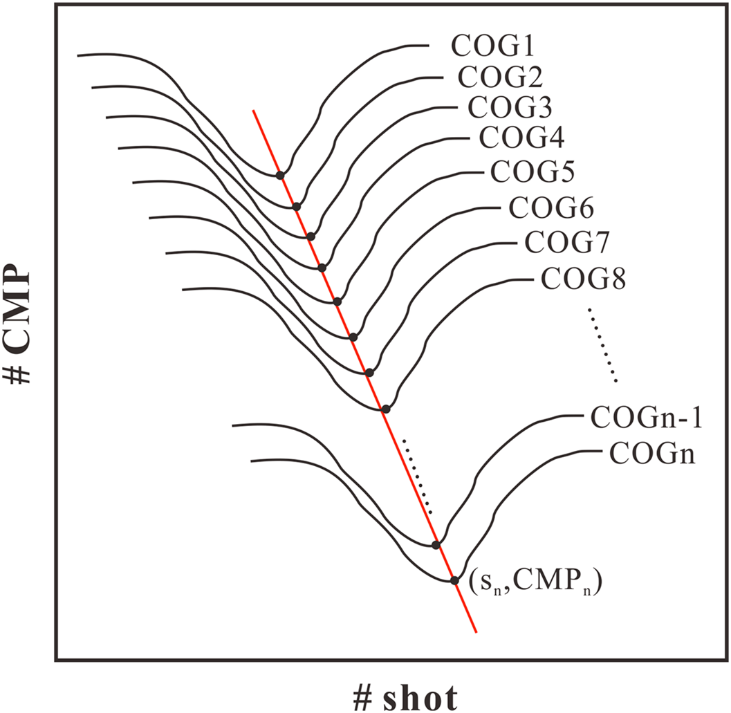 Processing schemes for COG migrated sections are the same as those for conventional stacked seismic section, except that the NMO correction is not applied and CMPs are not stacked. After the third step in section “Typical Seismic Section Processing,” the COGs are resorted from the CMPs according to the offset and a prestack time migration is applied to the COGs. After completing the above steps, a series of COG migrated sections can be obtained.