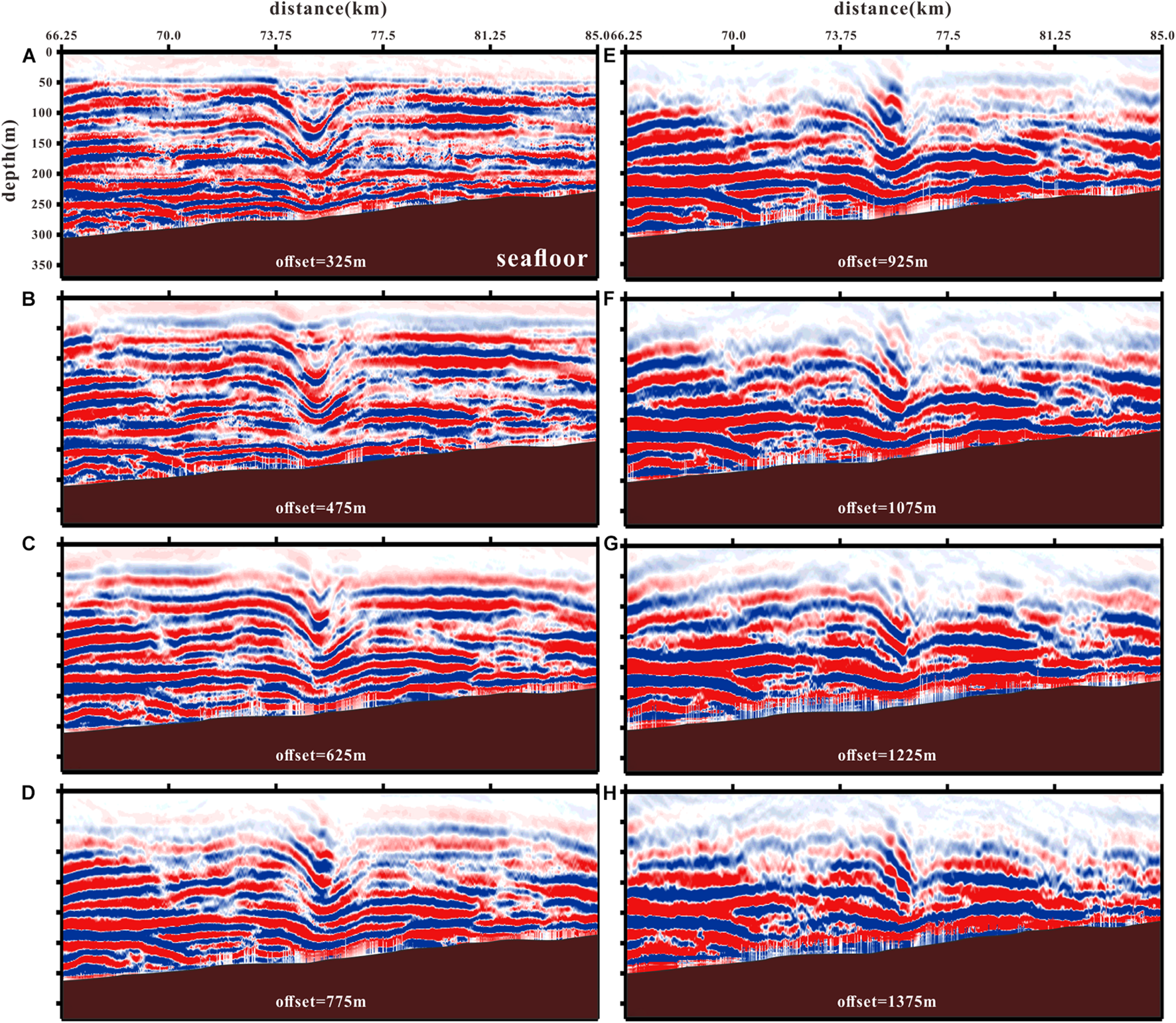 (A–H) Common offset gather (COG) migrated sections with different offsets. For conciseness, only eight sections are shown out of 23 collected. The brown areas represent topography. Seismic section displayed in color and red events are traced to study the internal solitary wave waveforms.