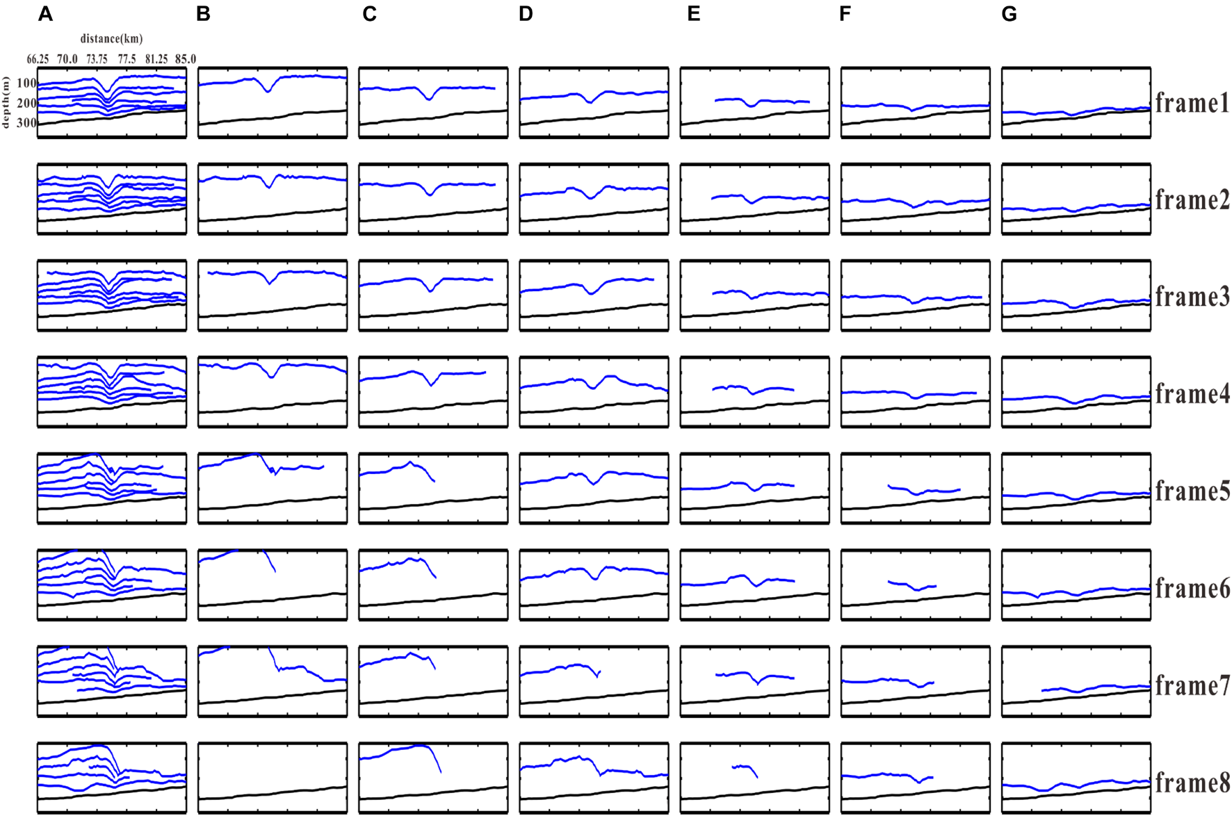 To investigate the waveform evolution in more detail, we pick six seismic events from the eight COG migrated sections (Figure 5), which are shown in Figure 6. Those seismic events represent the waveforms at six different depths. As shown in Figure 6A, as the internal solitary wave moved rightward on the slope, its rear edge shallowed and its slope increased, while the leading edge gradually became flat and the slope decreased. The shape change of waveforms at the different depths is clearly different. In Figures 6B–G, the shape change of each waveform can be viewed, respectively. The first waveform (Figure 6B) was somewhat symmetrical in the first four frames of the image and changed significantly from the fifth frame. In frame 5, the depth of leading edge increased and the shape became flat. An abnormal reflection like “knotting” appeared in the trough. The trailing edge became shallower and the slope increased. Subsequently, in frame 6, the trailing edge continued to become shallower and there was a break in the trough, which resulted in leading edge reflection missing. The broken waveform in frame 7 was connected to the leading edge of the third waveform below and formed a complete new waveform again. There is no first waveform in the frame 8 image because it cannot be accurately identified in the corresponding COG migrated section. The second waveform (Figure 6C) is similar to the first one. The shape of waveform changed from a somewhat symmetrical shape to one with increasing trailing edge slope and decreasing leading edge slope. Eventually, the leading edge broke and the trailing edge connected to the third waveform. The third waveform (Figure 6D) maintained a good symmetry in frame 1 to frame 6 and the change started in frame 7. In frame 7, the waveform was broken and connected to the fourth waveform in frame 8. Except for breaking in frame 8, the fourth waveform (Figure 6E) remained intact in the rest of frames. This waveform is close to the seafloor and the phenomenon that trailing edge slope is larger than leading edge slope already appeared in the first frame. The fifth waveform (Figure 6F) and the sixth waveform (Figure 6G) did not change significantly and there was almost no change in the shape, except for the wave moving up-slope in all the eight frames.