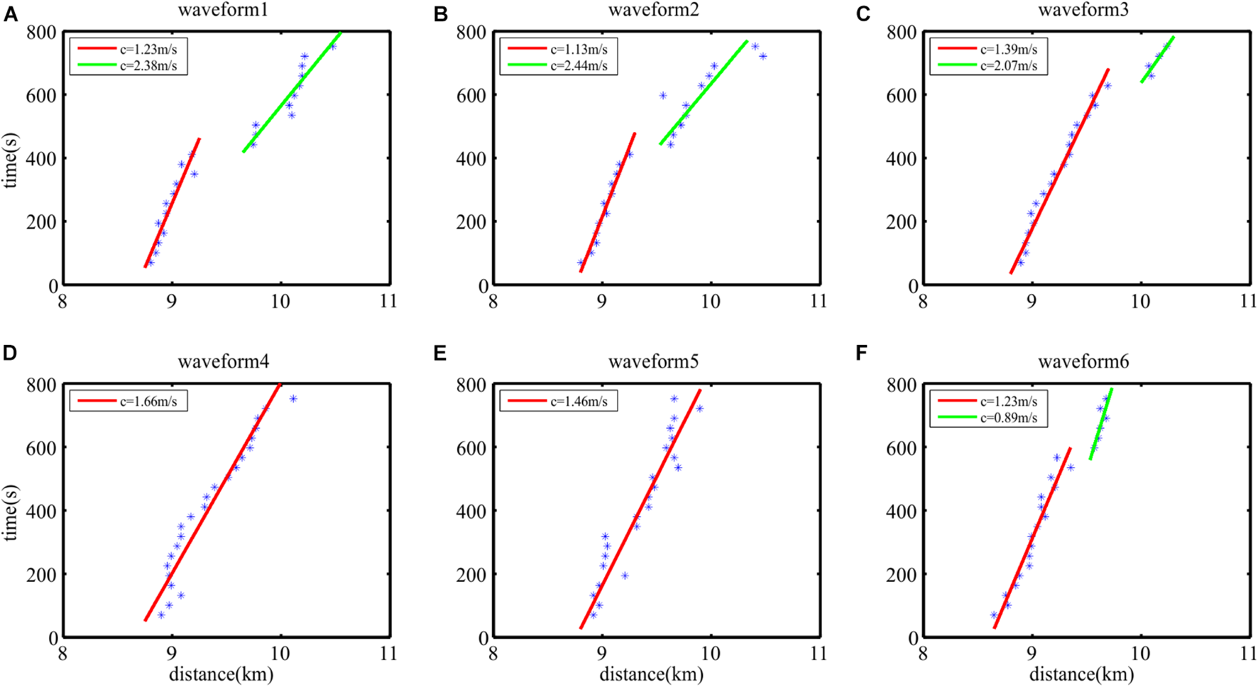Linear fitting in phase velocity calculation process of the six waveforms. (A–F) The blue asterisks indicate the trough of waveform. The red and green lines are fitting lines of blue asterisks. The common midpoint (CMP)-shot coordinates have been converted into the distance-time coordinates, so that the slope of fitting line is the phase velocity. The red and green lines are different fitting of asterisks, which indicate that the internal solitary waves travel in different phase velocity.