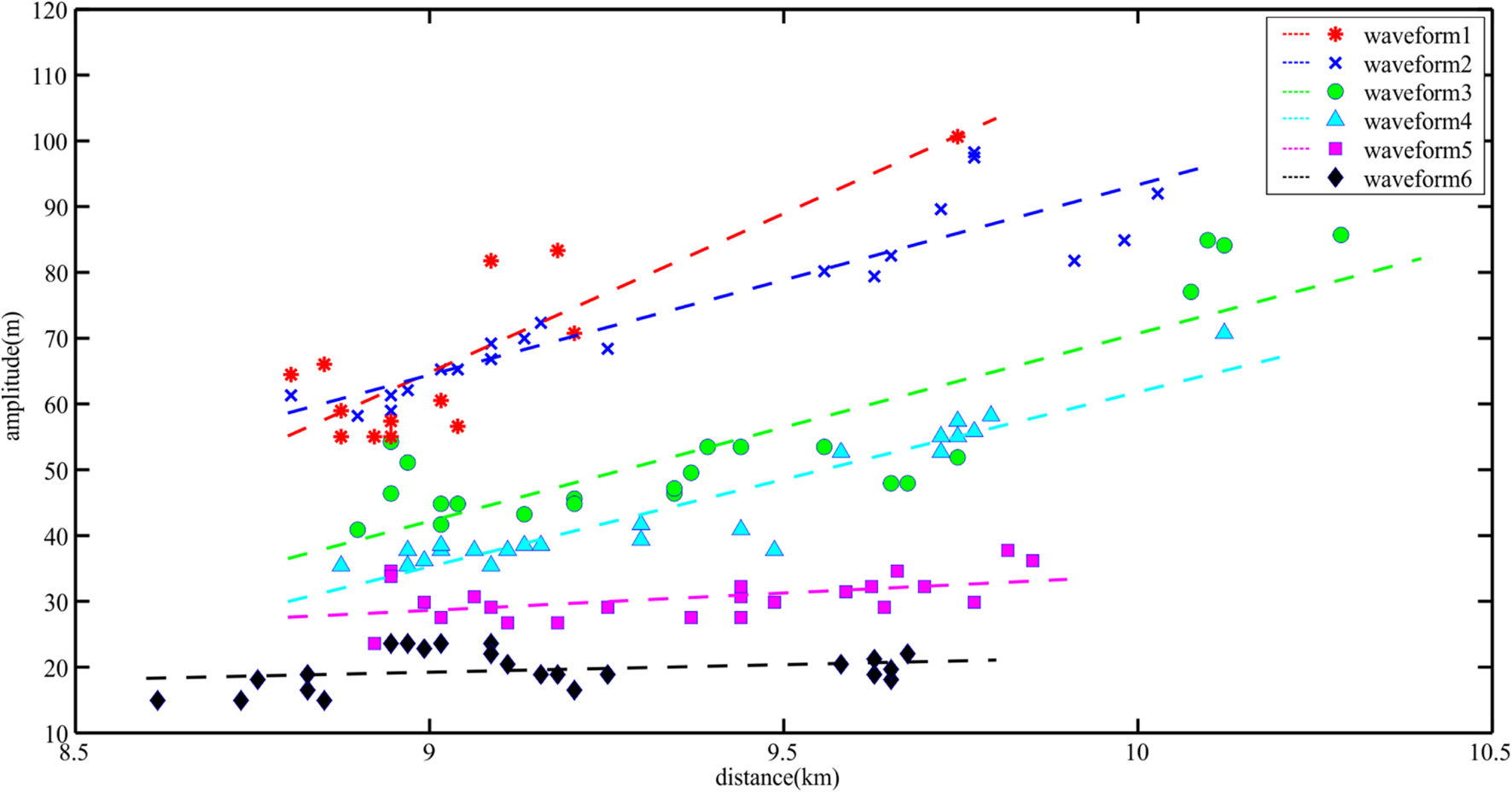The change in amplitudes of the six waveforms. The amplitudes picked from different waveform are shown by colored scatters. The lines are linear fitting of the marks with same color. The meaning of each colored mark is shown in the upper right legend. The internal solitary wave is moving forward along the X coordinate.