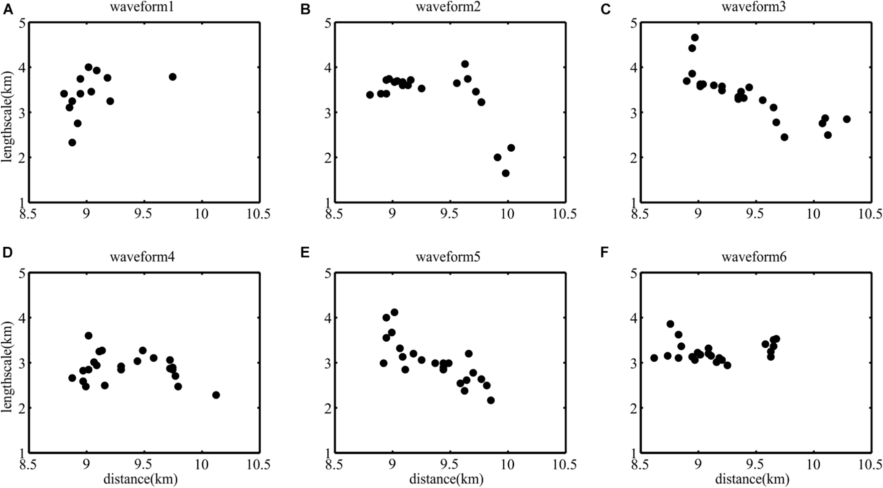 The change in wavelength of the six waveforms. (A–F) The black dots are observed wavelength.