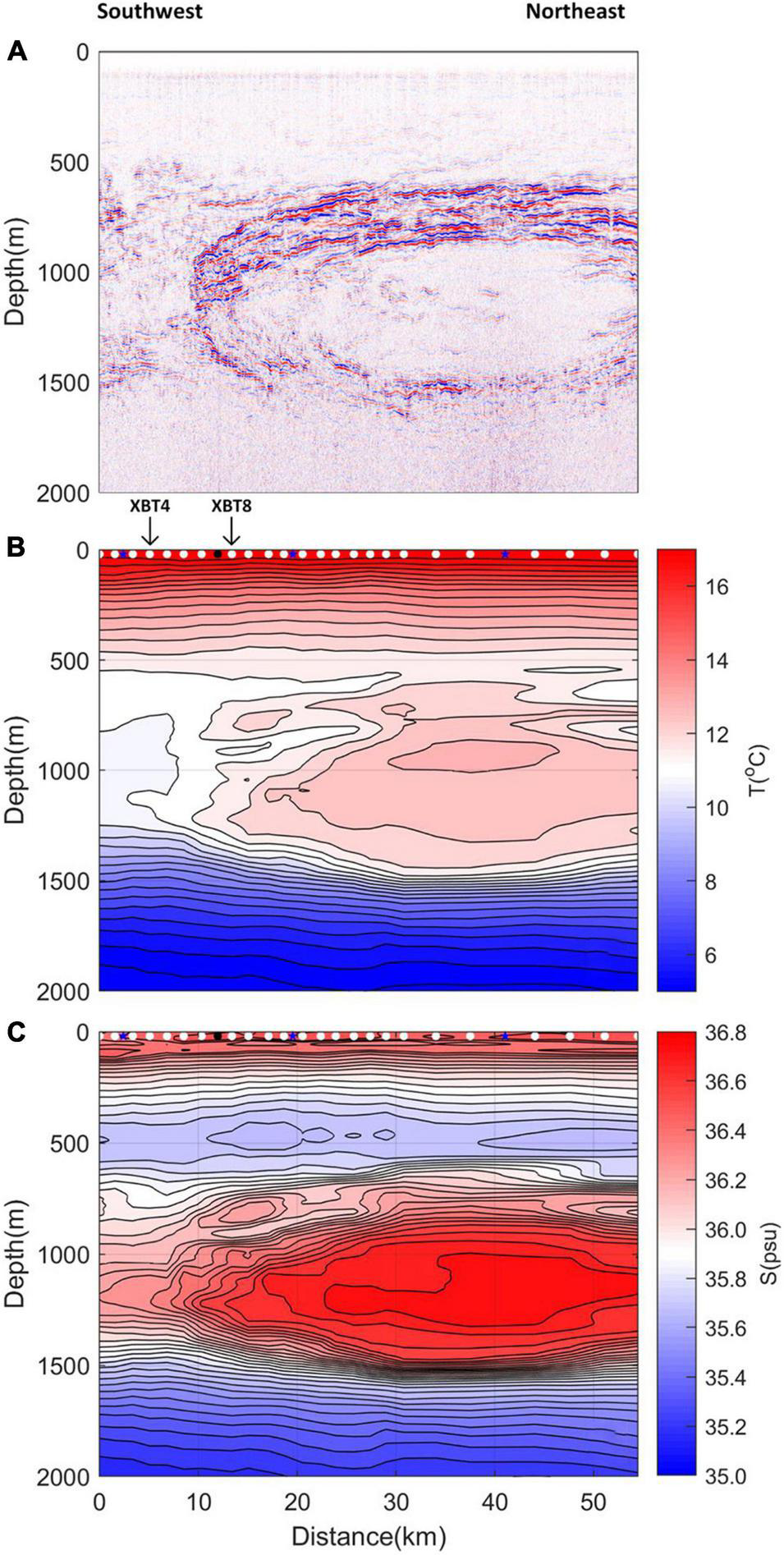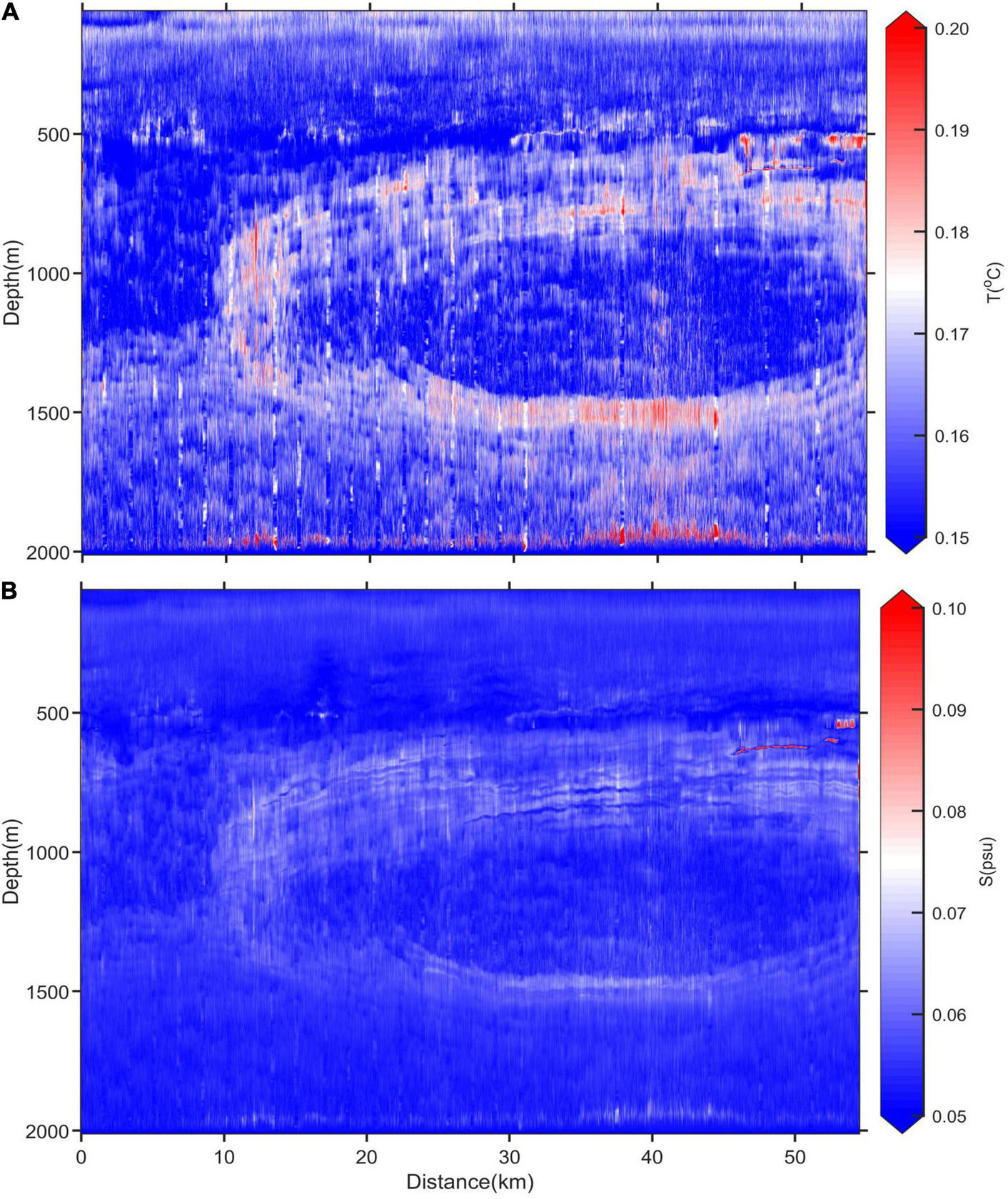 where Robs(CMP,d) and Rpred(CMP,d) represent the measured and predicted reflectivity data at each CMP and depth, and σe is the measured data uncertainty. Robs was computed by summing the high frequency component of the reflectivity, Rhigh_freq_seismic, obtained from the seismic data (band-pass filtered to 10–80 Hz), with the low frequency component (<10 Hz, Rlow_freq_XBT) deduced using XBT interpolated temperature and salinity fields (Figure 2) following Biescas et al. (2014). As such Robs = Rhigh_freq_seismic + Rlow_freq_XBT. Rpred (CMP, d)was computed from the vertical profile of the starting model (Rlow_freq_XBT), but with the temperature or salinity value at depth, d, sampled from a prior distribution. This prior distribution was obtained using the standard deviation of starting model temperature and salinity values within a vertical 40 m window of d (i.e., the vertical spatial resolution, L0∼ 40 m, corresponds to a frequency, fo, of 10 Hz following Lo = c/4fo, where c = 1,500ms−1is the sound speed (Sheriff and Geldart, 1995). σe was estimated as 7.06 × 10–6, the ambient seismic noise calculated as the standard deviation of seismic reflectivity within an area beneath the meddy where there are no strong seismic reflections. The ambient noise was found to follow a normal distribution. See Tang et al. (2016) for further details of inversion procedures.