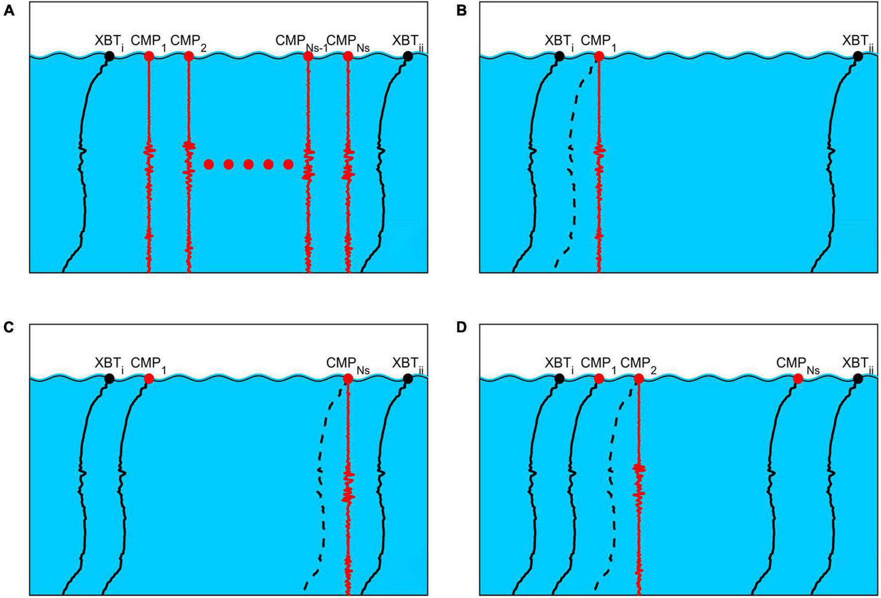 Schematic of inversion unit and iterative MCMC approach. Black dots indicate XBT positions that bound the inversion unit (XBTi and XBTii). Solid black lines represent the prior temperature-depth model as a function of depth. Red dots represent positions of Ns seismic CMPs, and red wiggles show associated seismic reflectivity depth profiles used in inversion. Dashed lines represent newly inverted temperature-depth profiles. (A) Starting data within inversion unit. (B) CMP 1 is inverted using prior model from XBT data. (C) Inverted data from CMP 1 is used to update the prior model. CMP Ns is inverted. (D) Inversion from CMP Ns is used to update prior model, and CMP 2 is inverted. The process is repeated for CMP Ns-2…CMP 3… until the whole inversion section has been processed.