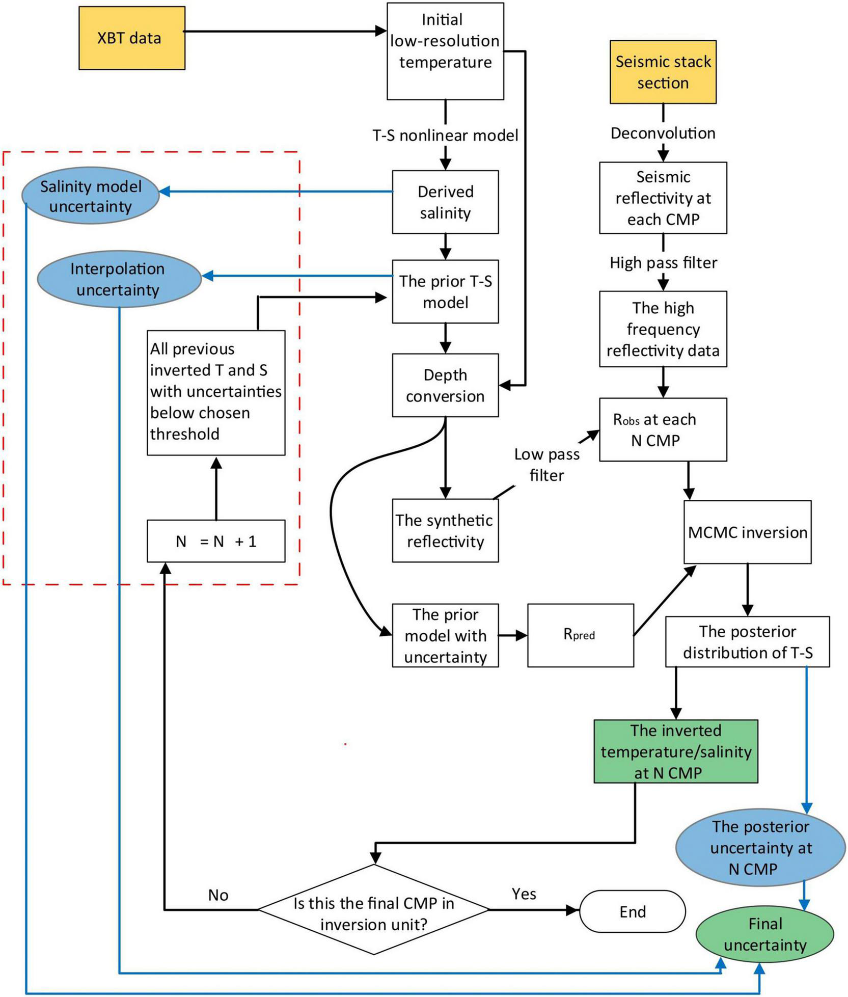 Flow diagram summarizing the iterative MCMC inversion procedure. Rectangular shapes represent processing steps. Yellow rectangles represent the starting points of one inversion loop (input temperature profile and seismic data). Blue circles indicate the uncertainties relating to methods, data or models. Green rectangles represent output of inverted results and their corresponding uncertainties. Stages surrounded by red dashed lines represent updates to Tang et al. (2016). Note that the synthetic reflectivity is calculated from the prior temperature-salinity model following Ruddick et al. (2009).