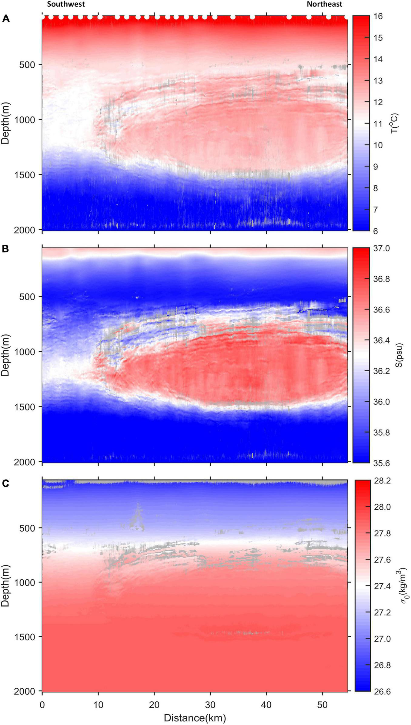 MCMC inversion results of seismic section for (A) temperature, (B) salinity and (C) potential density anomaly. 24 XBTs (white dots) are used to compute the prior model, which is iteratively updated with inversion results. The inversion is performed at every CMP. Seismic data above 60 m depth is discarded due to the contamination from the residual direct wave. No reflectors were present below 2,000 m. Grayed out regions mark areas of high uncertainty (i.e., within the top 5% of uncertainties across the section).
