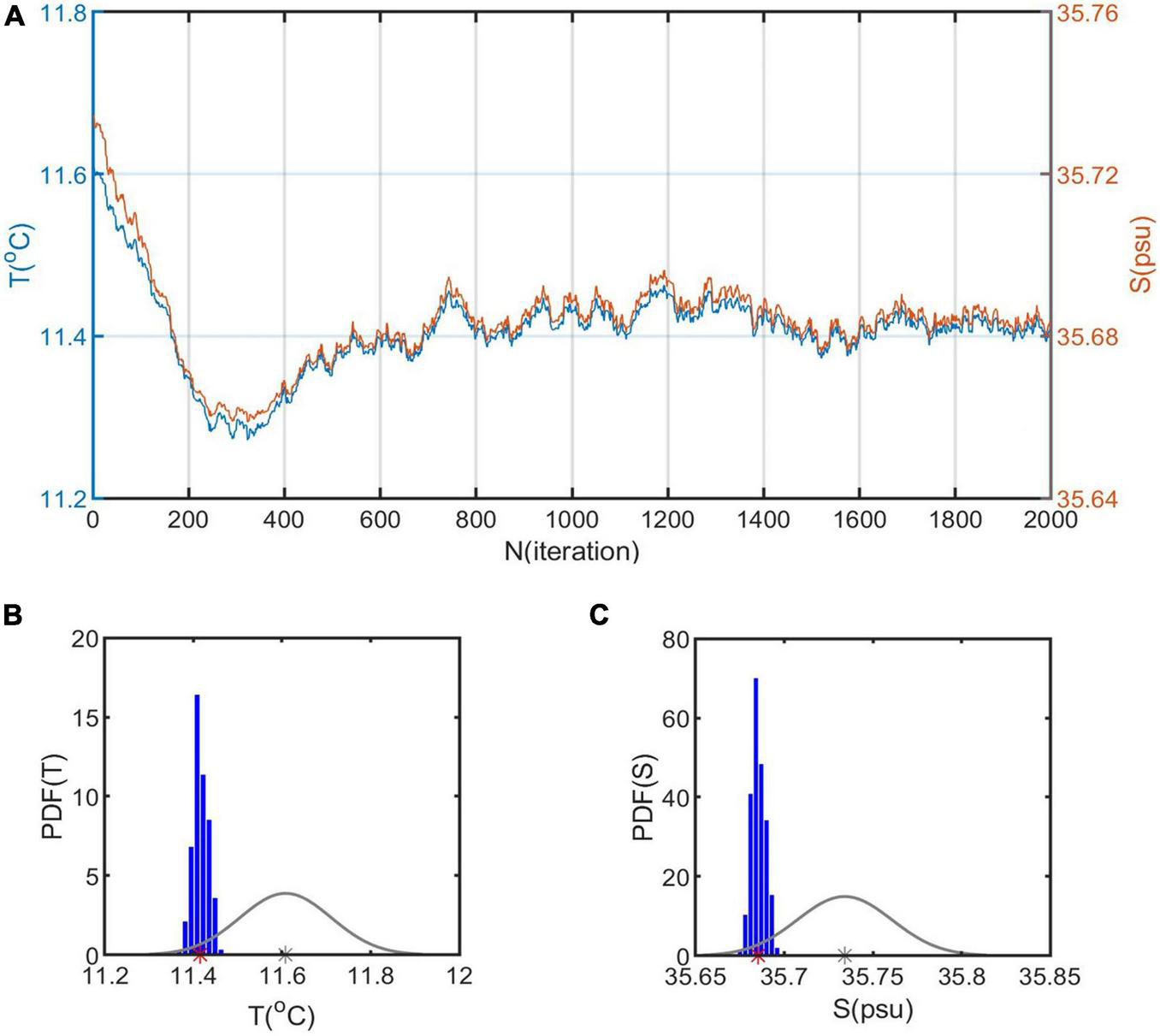 (A) The Markov temperature and salinity chain at depth 539 m, CMP 2300. (B) Associated temperature prior and posterior probability density functions (PDFs). Gray curve = prior distribution of temperature. Gray star = mean of temperature prior distribution. Blue bars = posterior distribution. Red star = the mean temperature of the posterior distribution. (C) As for panel (B) but for salinities.