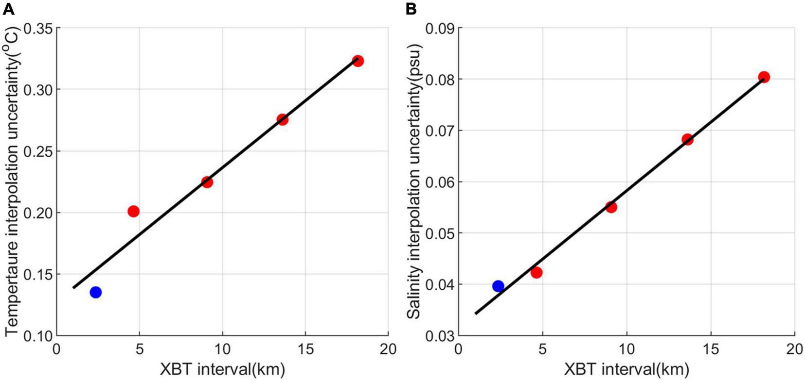 (A) Variation of prior model interpolation temperature uncertainty (for the whole section) with XBT sampling resolution. Blue dot highlights slightly different method used to compute uncertainty when all 24 XBTs are included (see section “Materials and Methods”). (B) As for panel (A) but for salinity uncertainties.