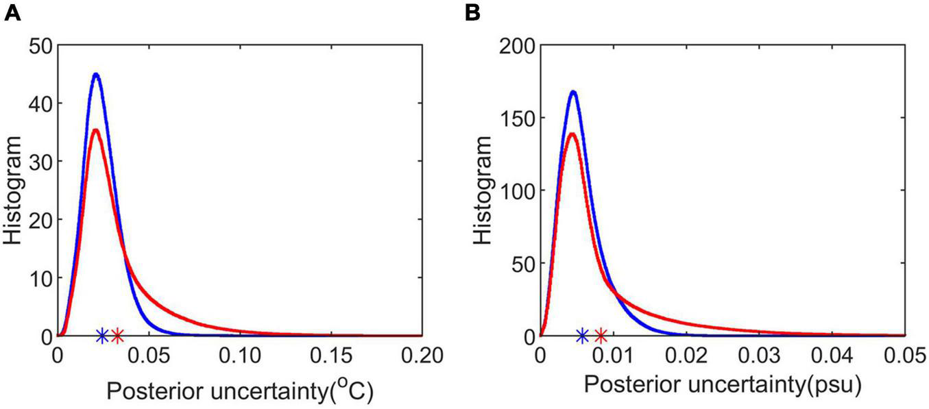 Comparison of stationary and iteratively updated posterior inversion uncertainties. (A) Red (blue) lines show the histogram of posterior temperature uncertainty MCMC distribution for stationary (iterative) prior model. Stars indicate the mean of distribution. (B) As for panel (A) but for salinity uncertainties.