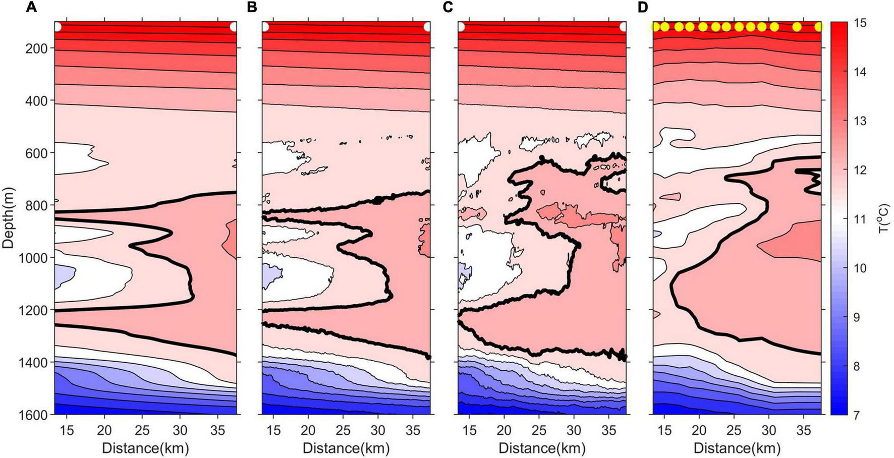 Comparison of MCMC inverted temperature fields using a stationary and iteratively updated starting model. Colored contours show temperature fields, and the thick black line follows the 12.21°C temperature contour, chosen to highlight the meddy structure. (A) Initial reduced XBT-based temperature model used for inversion results shown in panels (B,C) based on interpolation of two XBTs approximately 30 km apart: white dots mark XBT locations. (B) Inverted temperatures using the starting model as shown in panel (A) at each inversion location (i.e., a stationary prior model). (C) Inverted temperature field in which the starting model is iteratively updated at each horizontal position with previous inversion results (see section “Iteratively Improving the Prior Model”). (D) As for panel (A) but the high-resolution temperature field constructing using all available XBT data. Yellow dots mark XBT locations.