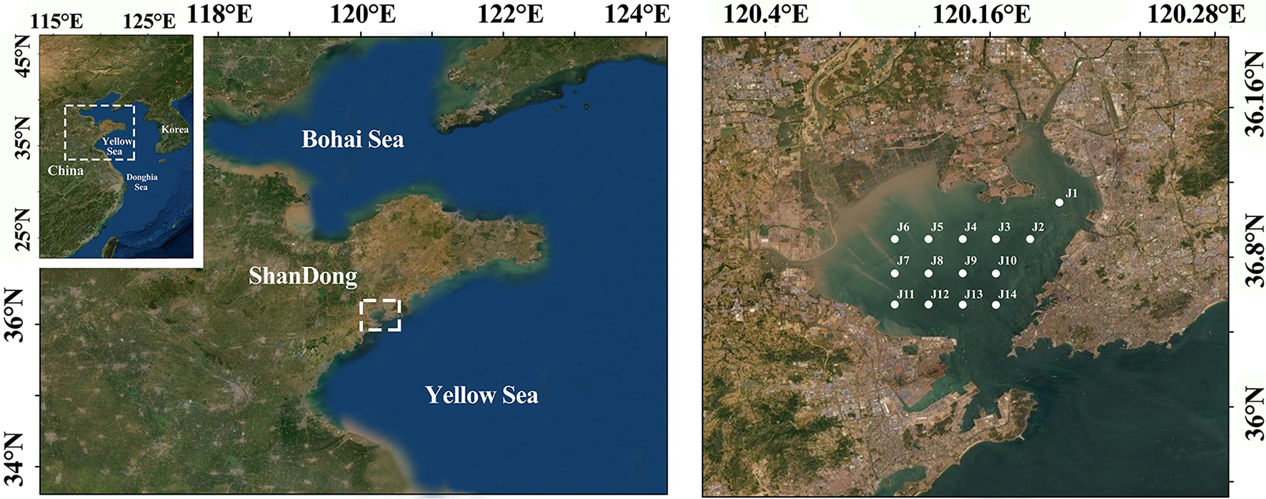 Study area and locations of sampling sites in coastal waters of Jiaozhou Bay.