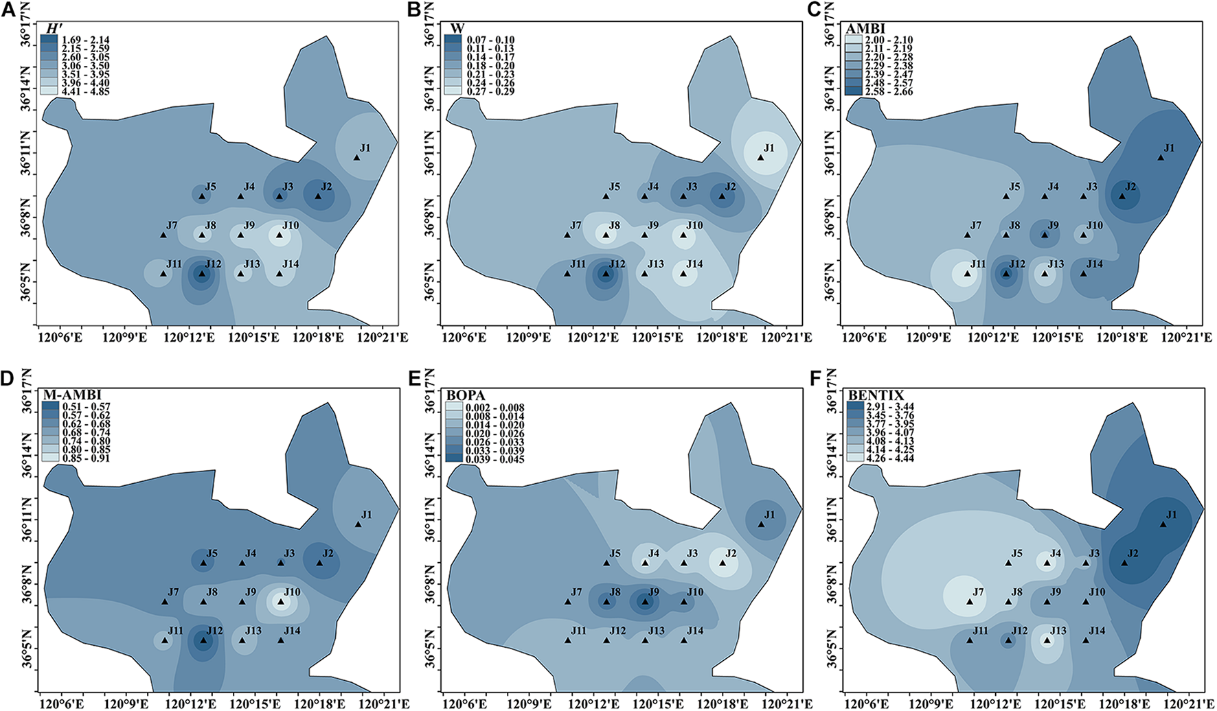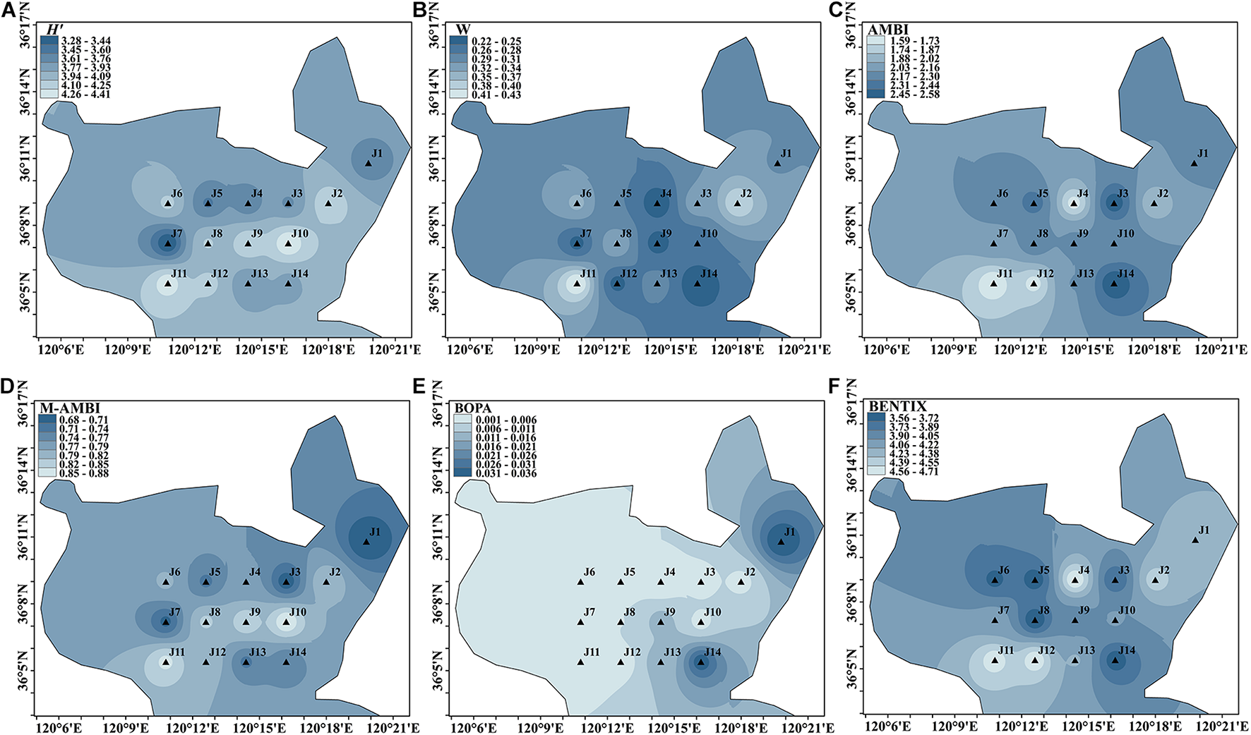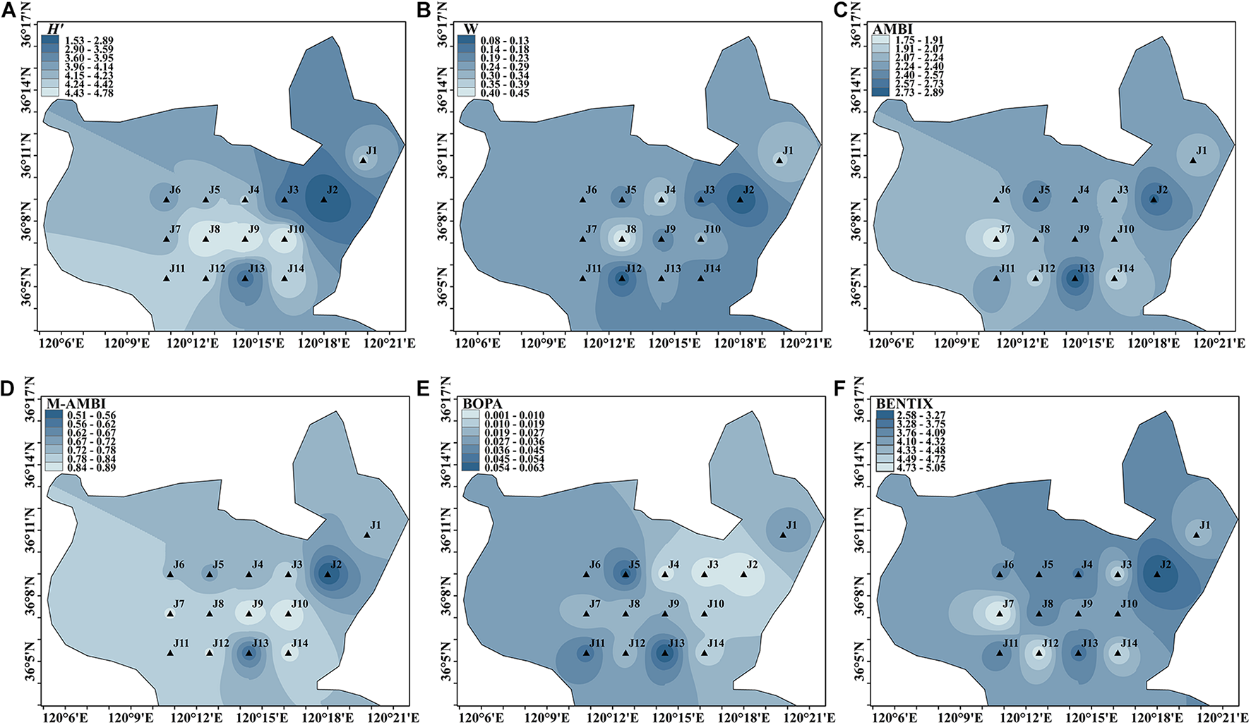 Spatial distribution of environmental assessment in summer cruise in Jiaozhou Bay, H′ (A), W(B), AMBI (C), M-AMBI (D), BOPA (E), and BENTIX (F).