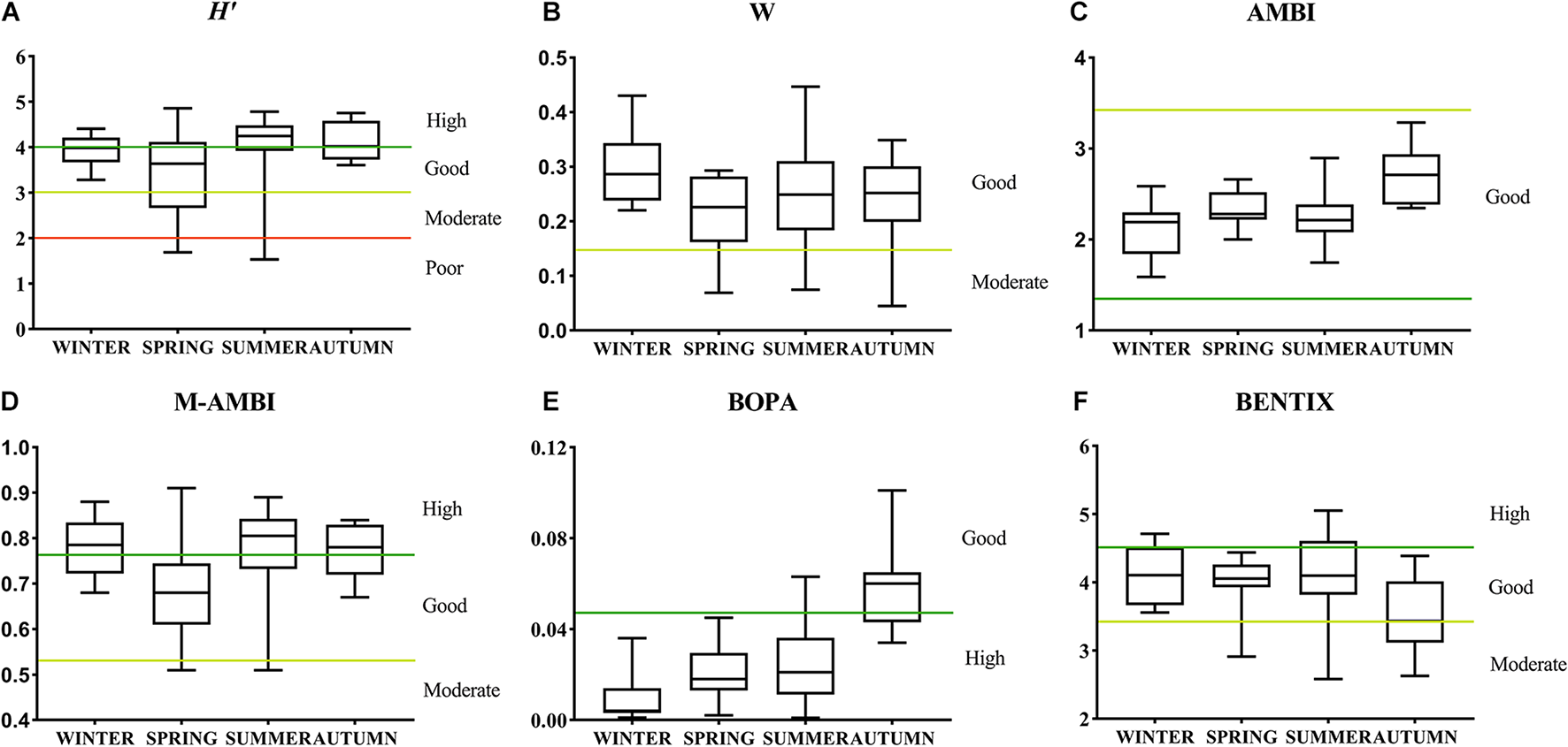 Seasonal differences in the environmental assessment of different biological indices in Jiaozhou Bay. The label on the right axis (“Poor to High”) indicates ecological status. Values are medians (horizontal lines), the range between the 25th and 75th percentiles (boxes), and the minimum and maximum values. H′ (A), W(B), AMBI (C), M-AMBI (D), BOPA (E), and BENTIX (F).