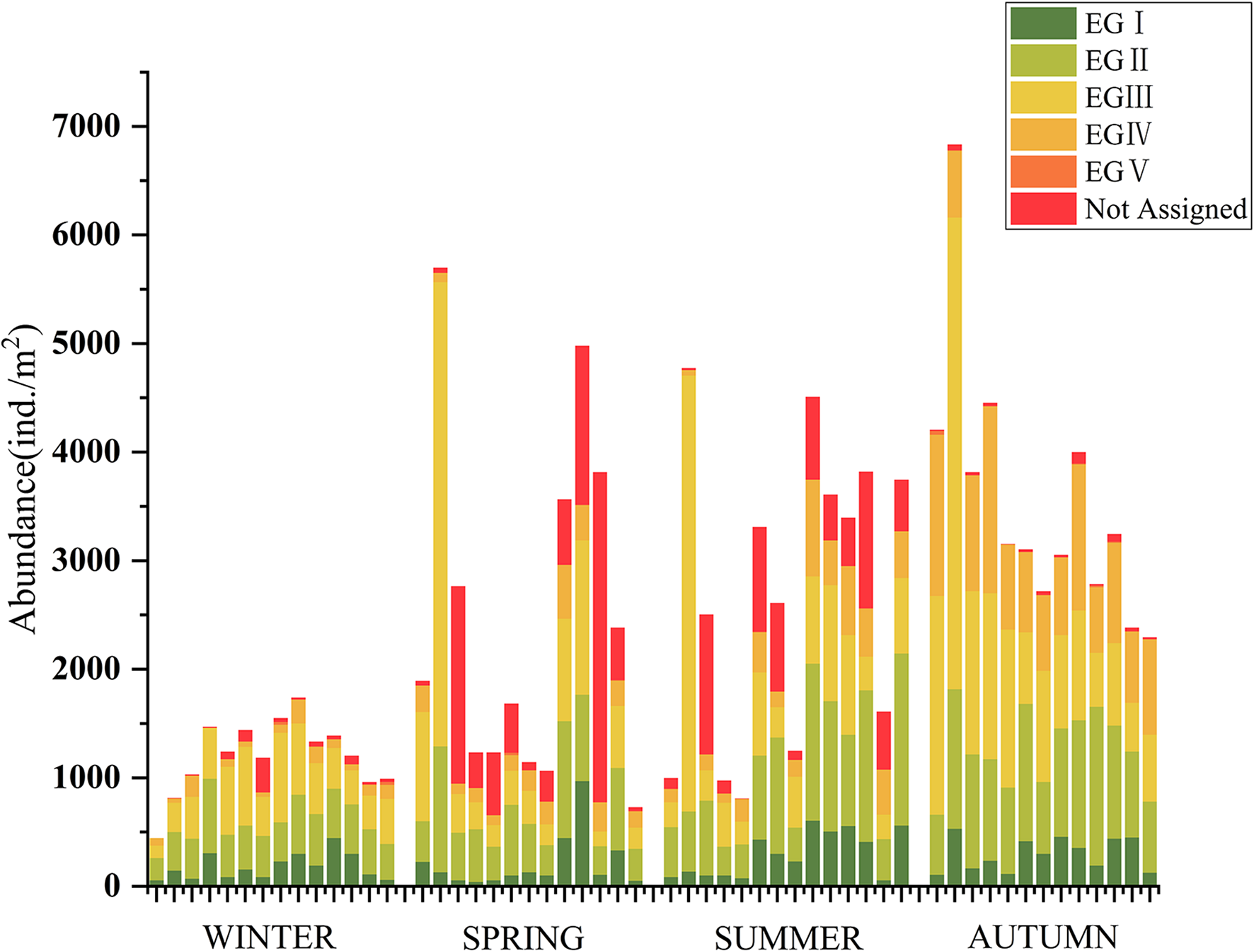 Abundance of groups at different sites of four cruises based on the AMBI species list in Jiaozhou Bay. EGI–EGV: ecological groups I–V based on AMBI species list. Not assigned: the unassigned species based on AMBI species list.