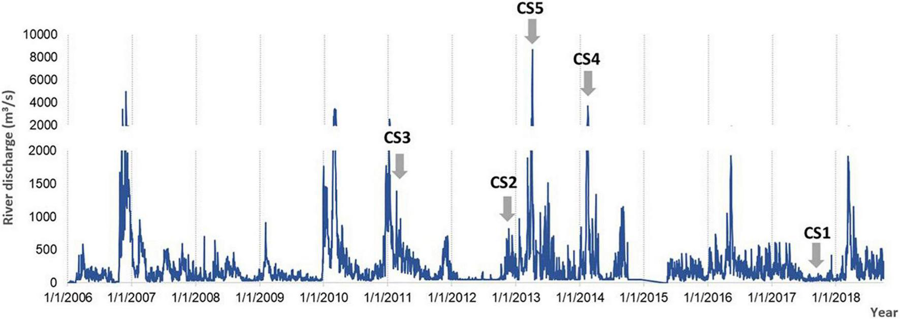 Daily average of the Tagus River discharge between 2006 and 2019 with indication of the case studies period.