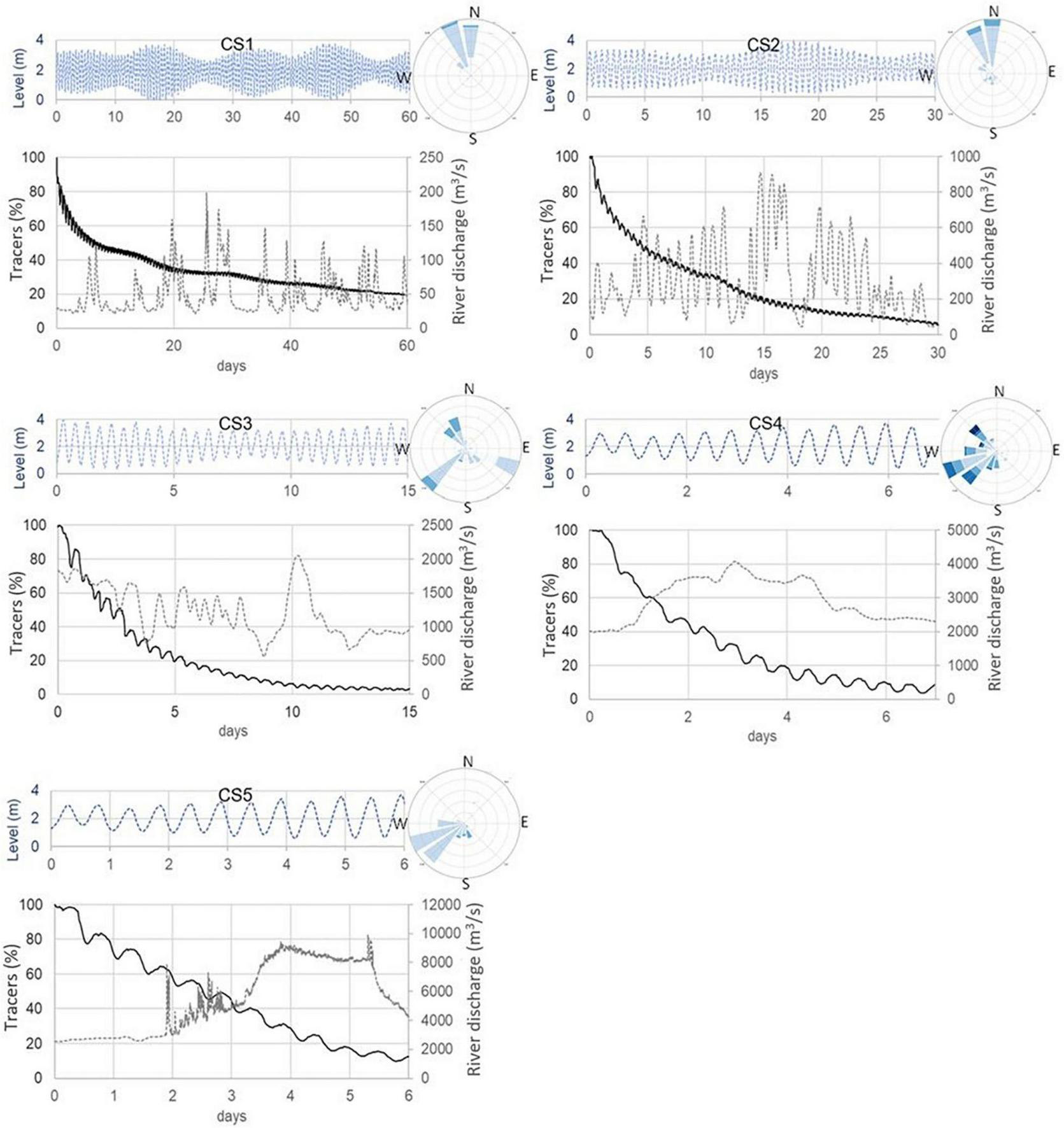 Real time input data observed during the studied period, as well as the percentage of tracers inside the estuary over time determined for the whole Tagus estuary and for the five case studies are shown in Figure 3. RT was achieved when the proportion of the initial tracers reached the 20% line for the first time, whilst ET was achieved when the proportion of tracers inside the estuary dropped below the 20% line (in comparison with the initial state) and did not go up the 20% line again. The simulations were carried out until 80% of the tracers had moved to the shelf. For all case studies half of the initial tracers were lost within the first week of simulation, independently of the river discharge (6.6, 4.5, 2.3, 1.5, and 2.5 days for CS1, 2, 3, 4, and 5, respectively). No significant differences were observed between RT and ET for the entire estuary, and for the five case studies (Figure 3). The highest and lowest value for all case studies were determined for CS1 (59 days) and CS4 (3.5 days), respectively. For CS2, 3 and 5 these hydrodynamic indicators values were 15, 5.5, and 4.5 days, respectively (Figure 3). For CS1 the river discharge was always lower than 200 m3/s and the wind was weak. Similar metocean conditions were observed for CS2 and 3, but with a higher river discharge in CS3 where the highest river discharge registered reached 909 m3/s. For CS4, apart from the river discharge, which remained above 2,000 m3/s during the studied period, high wind intensities were observed. On the contrary, for the most extreme river discharge (CS5), wind conditions were weak during the simulation period (Figure 3). Regarding wind direction, in CS3 to 5 winds prevailed from southeast, a typical situation of the raining season in this area. The tide level variation was identical for all case studies and covered at least part of a neap tide and a spring tide.
