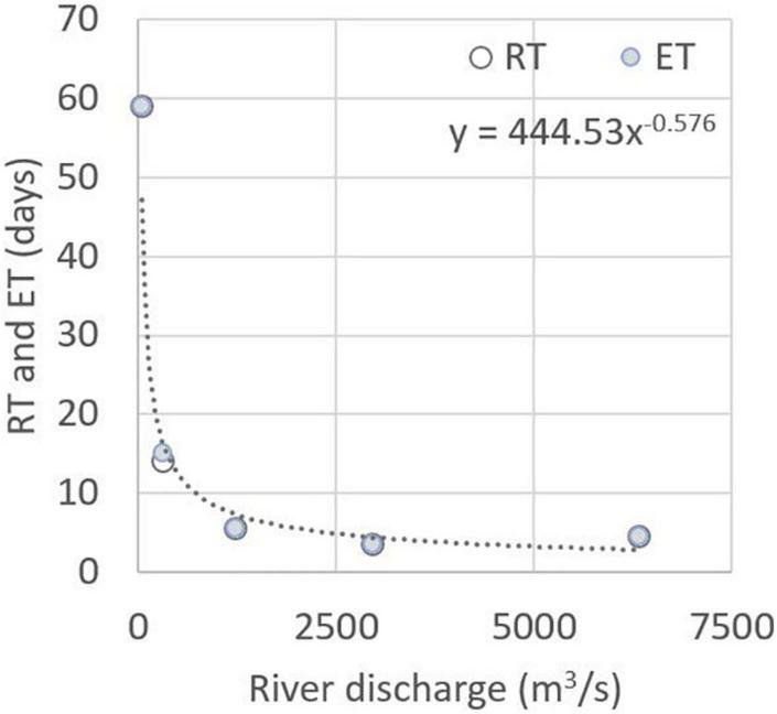 Variation of RT and ET (days) in function of the river discharge (m3/s).