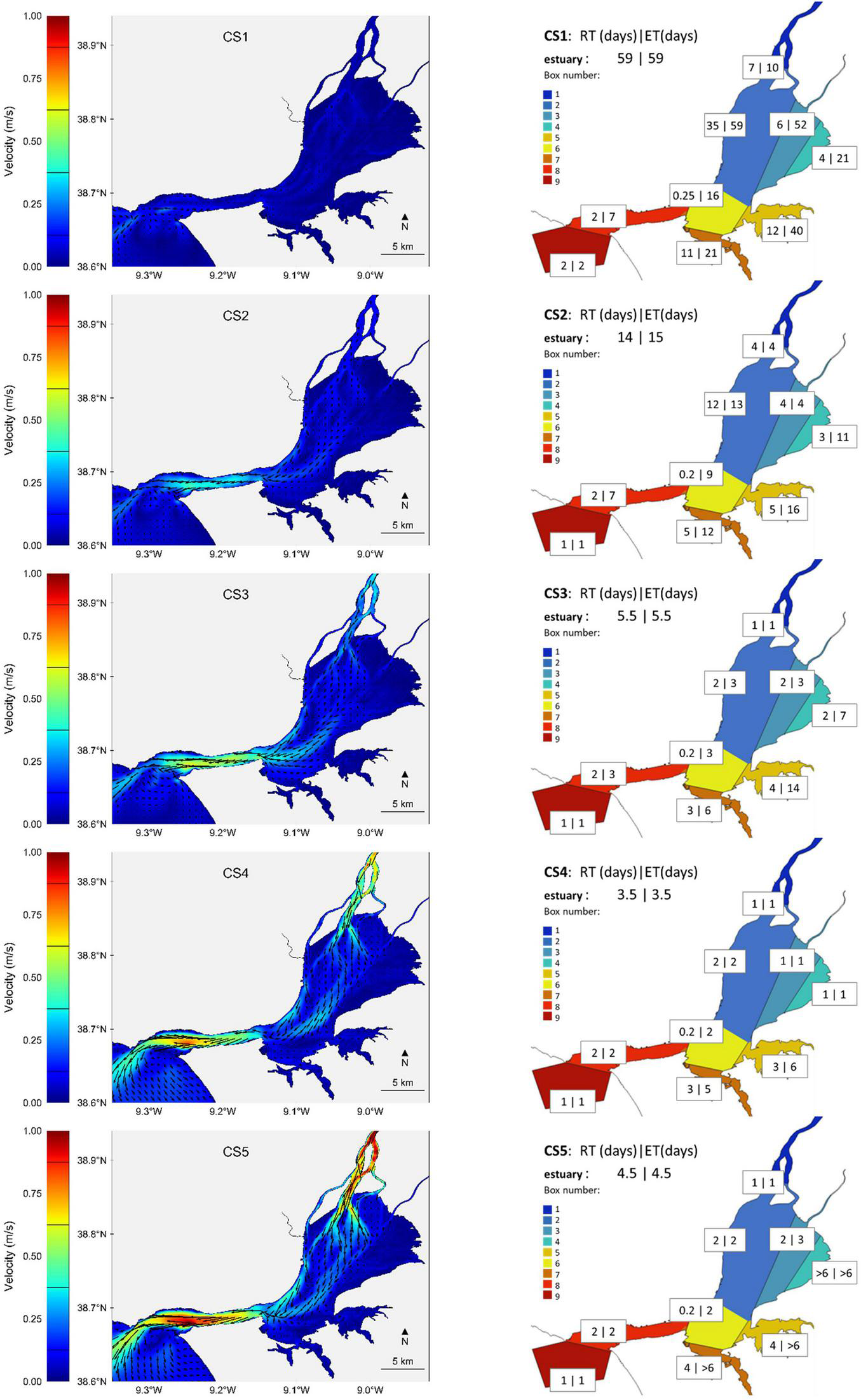 The main differences observed for the first four case studies were mainly observed in both the main body of the estuary and in the bays (boxes 2 to 7). The CS1 (low mean river discharge in the summer) presented the highest ET values, which reflects the low water velocities registered within the estuary. This indicates that the tide was the main driver of tracer dispersion. In this CS and for boxes 2 to 7, the ET ranged between 16 and 59 days, with the highest values registered in boxes 2 and 3, both located in the main body of the estuary. Since these two boxes cover a significant area of the estuary in its main flow direction, under low river discharges the harmonic effect of the tide caused tracers to return to those boxes for an extended period. This harmonic effect of the tide became less evident with the increase of the river discharge since the current velocities within the estuary increased, which explains the decrease of ET values determined for boxes 2 to 7 in the CS2, 3, and 4. It is interesting to note that with the increase of the river discharge the ET in the main body of the estuary tended to decrease to 1 to 2 days and to match RT, indicating that the tracers left the estuary very quickly, whereas in the bays, higher ETs were determined even in periods of extreme river discharge (CS4; 5 and 6 days for boxes 5 and 7, respectively). Thus, in the bays the tracers returned several times to these areas before leaving the estuary which explains the high differences observed between RT and ET in these areas. This is related to the lower current velocities registered, morphology, and the water recirculation pattern observed in this part of the estuary, which promoted the retention of the tracers in those areas for a longer time. Moreover, for all river discharges, results showed that the bays received little water from the most downstream areas (boxes 8 and 9) which is related to the circulation patterns observed in the estuary that prevented water from those areas to enter the bays, especially during the tidal flood.