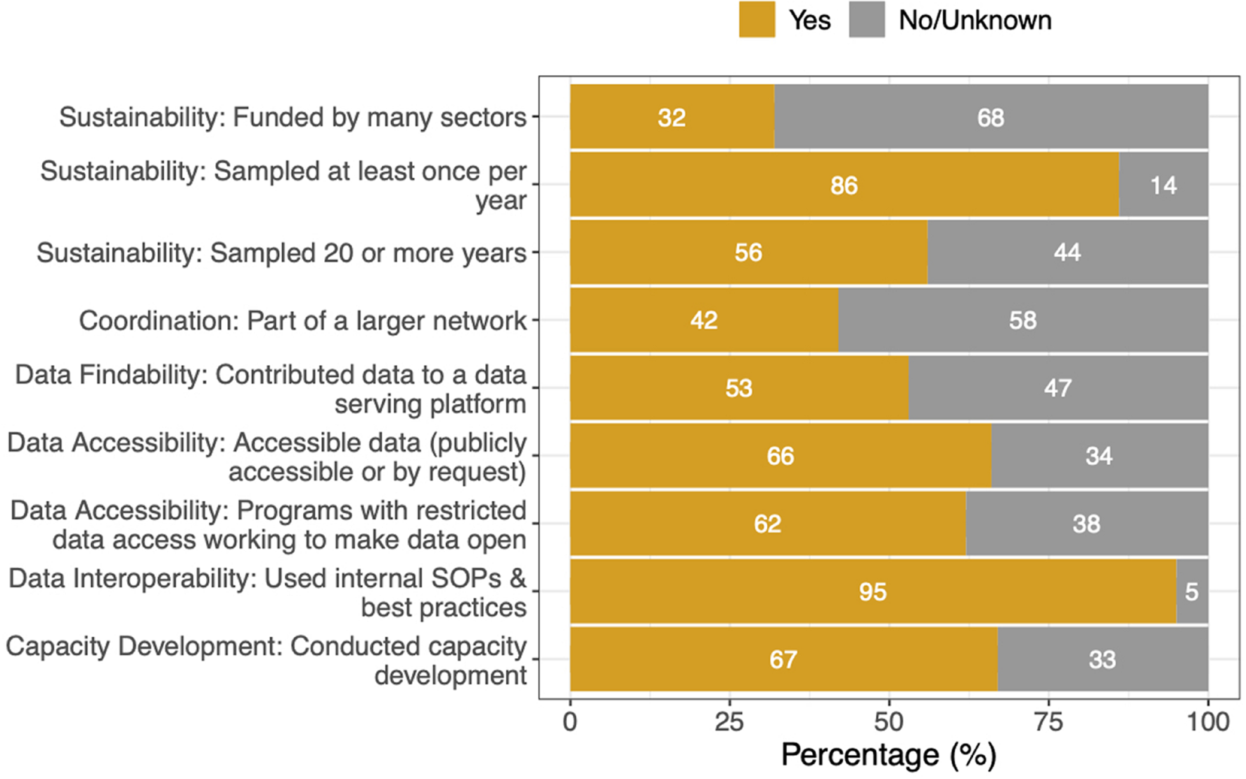 Bar plot based on survey responses displaying the 203 active, long-term observing programs sustainability (based on funding, sampling frequency, and duration), coordination, data management (including findable, accessible, and interoperable data), and existing capacity development efforts.