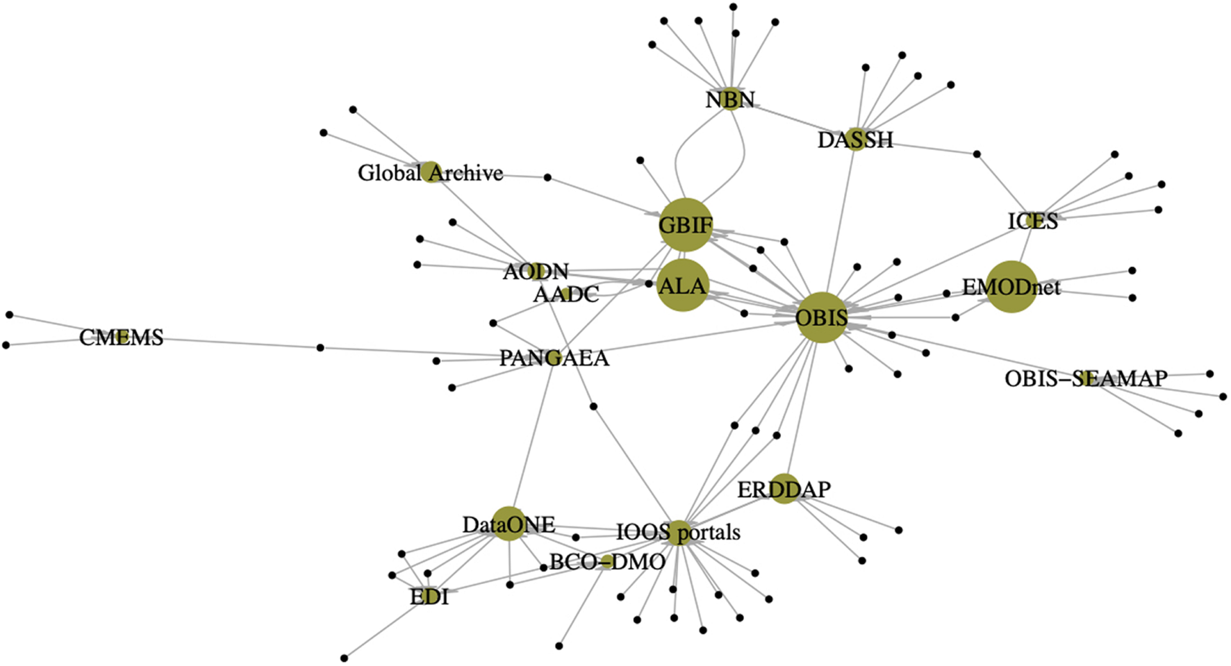 Network displaying data repositories, aggregators, or other data serving platforms (green circles; n = 18) and observing programs (small black circles; n = 73). Data servers and associated observing programs were only included in instances where three or more observing programs indicated that they provided data to a given data serving platform, in order to clearly display the most common data servers. The node size is scaled by the number of observing programs that provide data to a given data server, whether directly or through another intermediary. Larger nodes indicate data serving platforms with higher numbers of biological observing program datasets, whether the data were provided directly from the observing program or indirectly to the repository from another data repository (Acronyms are defined in Table 1).