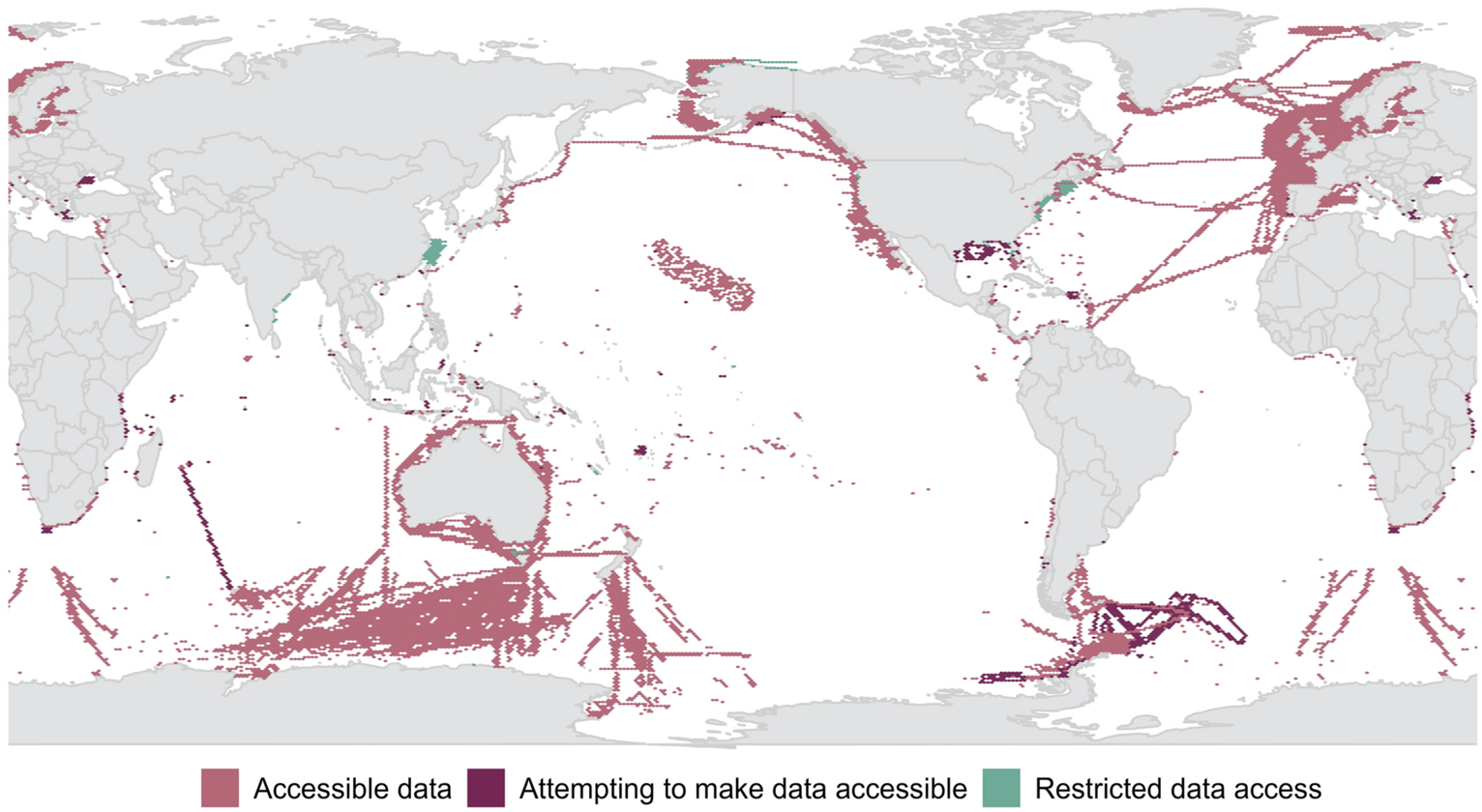 Spatial coverage of the 192 observing programs surveyed that had detailed spatial data and were currently active, had been sampling for 5 or more years, and sampled at least one EOV systematically (map displayed across ≥ 0.5° grid cell: about 55 km2 at the equator). Color differentiates data access, including data that are accessible whether publicly available online or accessible by request (pink), programs that are attempting to make data accessible (purple), and programs that have restricted data access (teal).