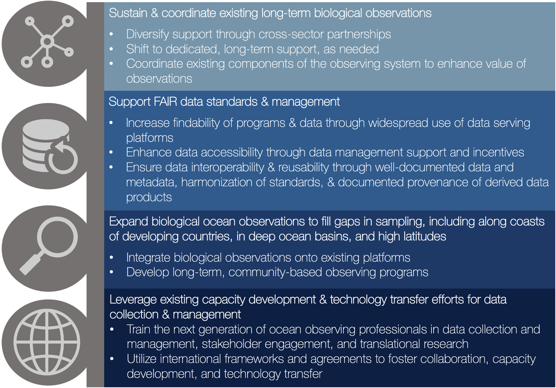 Marine ecosystems provide essential services to society, including food security, livelihoods, recreation, and nature-based climate solutions (Benway et al., 2019; König et al., 2019; Winther et al., 2020; Estes et al., 2021). Indeed, the ocean is opening new economic frontiers, and has been projected to provide over 3 trillion USD of added value to the global economy by 2030 (OECD, 2016). This demand for services is driving an increase in uses of the ocean at the same time that a rapidly changing climate is impacting marine ecosystems in ways that we don’t yet understand very well, limiting our ability to forecast and properly manage such uses in a sustainable manner (McCauley et al., 2015; Golden et al., 2017). Such an understanding requires information founded on scientific observations. Long-term and spatially representative measurements of marine ecosystems are vital to: (1) detect seasonal, annual, and decadal climate variability and trends, (2) distinguish between natural and human-induced change, (3) understand the causes of change (e.g., ocean warming relative to extractive industries), (4) understand ecological mechanisms (e.g., food web interactions) and consequences of change (including adaptive capabilities), and (5) improve coupled physical, biogeochemical, and ecological forecasting. Such information underpins marine ecosystem management, conservation and development efforts, informs indicators of progress toward globally-agreed upon goals and targets, and is fundamental to achieve socially equitable and ecologically sustainable ocean economies (Benway et al., 2019; Rayner et al., 2019). Collecting this information and sharing it with stakeholders worldwide requires a coordinated, integrated ocean observing system, as recognized by many international entities and processes, including the United Nations Decade of Ocean Science for Sustainable Development (2021–2030; Ryabinin et al., 2019; Heymans et al., 2020) and the High Level Panel for a Sustainable Ocean Economy (Winther et al., 2020).