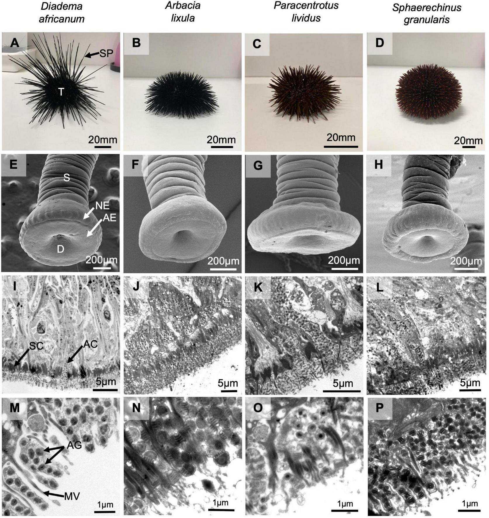 Echinoids used in this study: Diadema africanum(A,E,I,M), Arbacia lixula(B,F,J,N), Paracentrotus lividus(C,G,K,O) and Sphaerechinus granularis(D,H,L,P). Lateral view of whole sea urchins with spines (A–D). External morphology (SEM) of non-attached adoral tube feet (E–H). General view of the ultrastructure (TEM) of longitudinal sections through the disc of adoral tube feet (I–L) and a more detailed view of secretory cells containing adhesive granules (M–P). AC, adhesive secretory cell; AE, adhesive epidermis; AG, adhesive granule; D, disc; MV, microvillar-like cell projection; NE, non-adhesive epidermis; S, stem; SC, support cell; SP, spine; T, test.