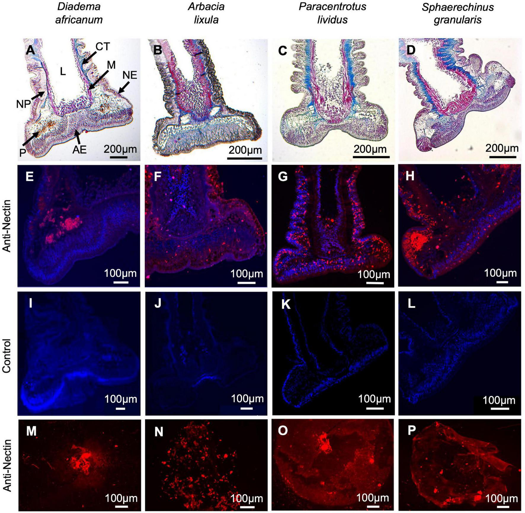 Histological structure and immunohistochemistry of longitudinal section through adoral tube feet and of footprints from Diadema africanum(A,E,I,M), Arbacia lixula(B,F,J,N), Paracentrotus lividus(C,G,K,O) and Sphaerechinus granularis(D,H,L,P). Staining with Masson’s Trichrome (A–D). Labeling (in red) with anti-P. lividus Nectin antibody of longitudinal section through adoral tube feet (E–H) and of footprints (I–L). Negative controls (M–P) in which the primary antibody has been replaced by buffer. AE, adhesive epidermis; CT, connective tissue; L, lumen; M, myomesothelium; NE, non-adhesive epidermis; NP, nerve plexus, P, pigment cells.