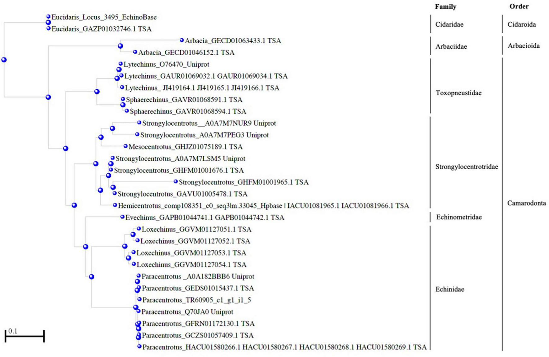 Amino acid similarity between Paracentrotus lividus Nectin and homologous proteins from ten other sea urchin species. A tree from given distances between sequences was produced using the algorithm Fast Minimum Evolution (Desper and Gascuel, 2004) available at COBALT. The scale bar indicates an evolutionary distance of 0.2 aa substitutions per position in the sequence. Sea urchin phylogeny according to Koch and Thompson (2020) is presented next to the tree (see also Figure 9), indicated by the corresponding orders and families of the analyzed species: Arbacia punctulata, Eucidaris tribuloides, Evechinus chloroticus, Hemicentrotus pulcherrimus, Loxechinus albus, Lytechinus variegatus, Mesocentrotus franciscanus, Sphaerechinus granularis and Strongylocentrotus purpuratus. Sequences were retrieved at UniprotKB, Transcriptome Shotgun Assembly Sequence Database, EchinoBase, HpBase and Pjeta et al. (2020).
