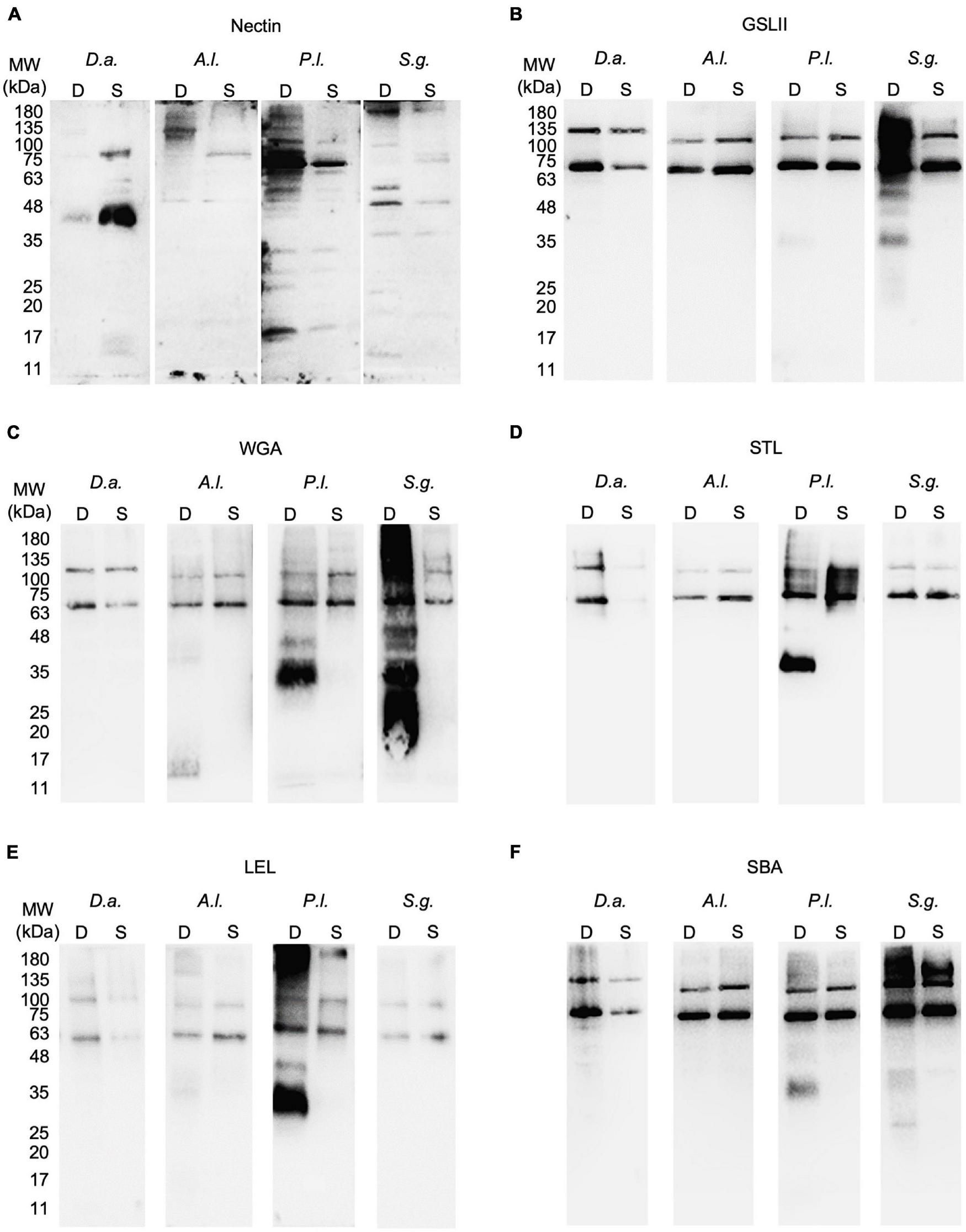 Protein and glycoproteins detected in tube foot disc and stem extracts from Diadema africanum, Arbacia lixula, Paracentrotus lividus and Sphaerechinus granularis using P. lividus Nectin antibody (A) and five lectins (B–F) respectively, GSL II, WGA, STL, LEL, and SBA. GSL II was used to detect proteins conjugated with N-acetylglucosamine; WGA, STL and LEL to detect chitobiose and SBA to detect N-acetylgalactosamine. Al, Arbacia lixula; D, disc; Da, Diadema africanum; GSL II, Griffonia simplicifolia lectin II; LEL, Lycopersicon esculentum lectin; MW, molecular weight markers; Pl, Paracentrotus lividus; S, stem; SBA, Soybean agglutinin; Sg, Sphaerechinus granularis; STL, Solanum tuberosum lectin; WGA, wheat germ agglutinin.