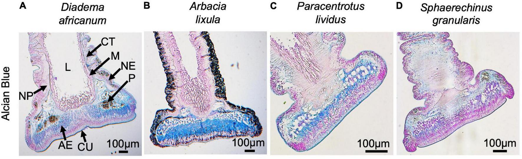 Histological structure of adoral tube feet from Diadema africanum(A), Arbacia lixula(B), Paracentrotus lividus(C) and Sphaerechinus granularis(D) stained with Alcian Blue pH 2.5 (longitudinal sections). AE, adhesive epidermis; CT, connective tissue; CU, cuticle; L, lumen; M, myomesothelium; NE, non-adhesive epidermis; NP, nerve plexus, P, pigment cells.