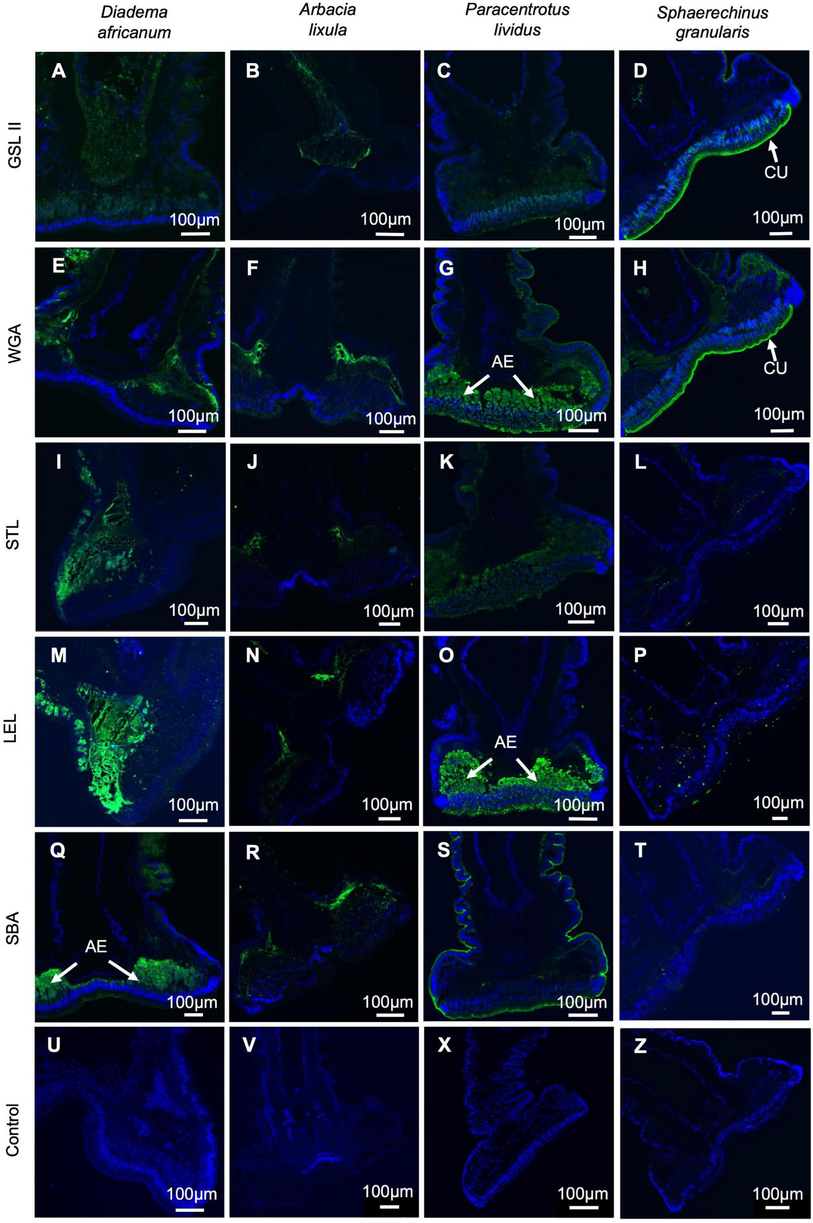 Lectin histochemistry on longitudinal sections through adoral tube feet from Diadema africanum(A,E,I,M,Q,U), Arbacia lixula(B,F,J,N,R,V), Paracentrotus lividus(C,G,K,O,S,W) and Sphaerechinus granularis(D,H,L,P,T,X). Labeling (in green) of N-acetylglucosamine using GSL II (E–H); chitobiose using WGA (I–L), STL (M-P) and LEL (Q–T), and N-acetylgalactosamine using SBA (U–X). Negative controls (U–Z) in which the lectin has been replaced by buffer. AE, adhesive epidermis; CU, cuticle; GSL II, Griffonia simplicifolia lectin II; LEL, Lycopersicon esculentum lectin; SBA, Soybean agglutinin; STL, Solanum tuberosum lectin; WGA, wheat germ agglutinin.