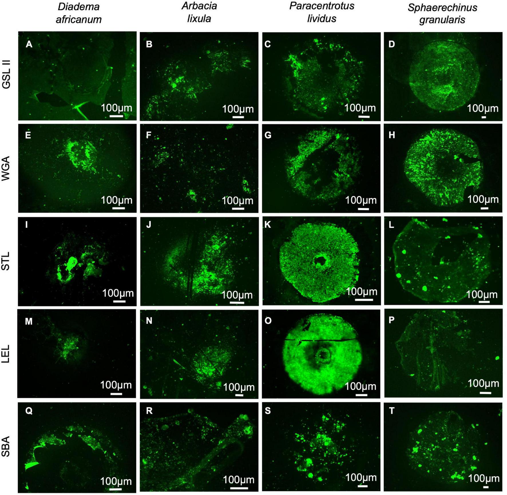 Lectin histochemistry of footprints deposited by adoral tube feet from Diadema africanum(A,E,I,M,Q), Arbacia lixula(B,F,J,N,R), Paracentrotus lividus(C,G,K,O,S) and Sphaerechinus granularis(D,H,L,P,T) using GSL II to detect N-acetylglucosamine (A–D); WGA (E–H), STL (I–L) and LEL (M–P) to detect chitobiose; and SBA (Q–T) do detect N-acetylgalactosamine. GSL II, Griffonia simplicifolia lectin II; LEL, Lycopersicon esculentum lectin; SBA, Soybean agglutinin; STL, Solanum tuberosum lectin; WGA, wheat germ agglutinin.